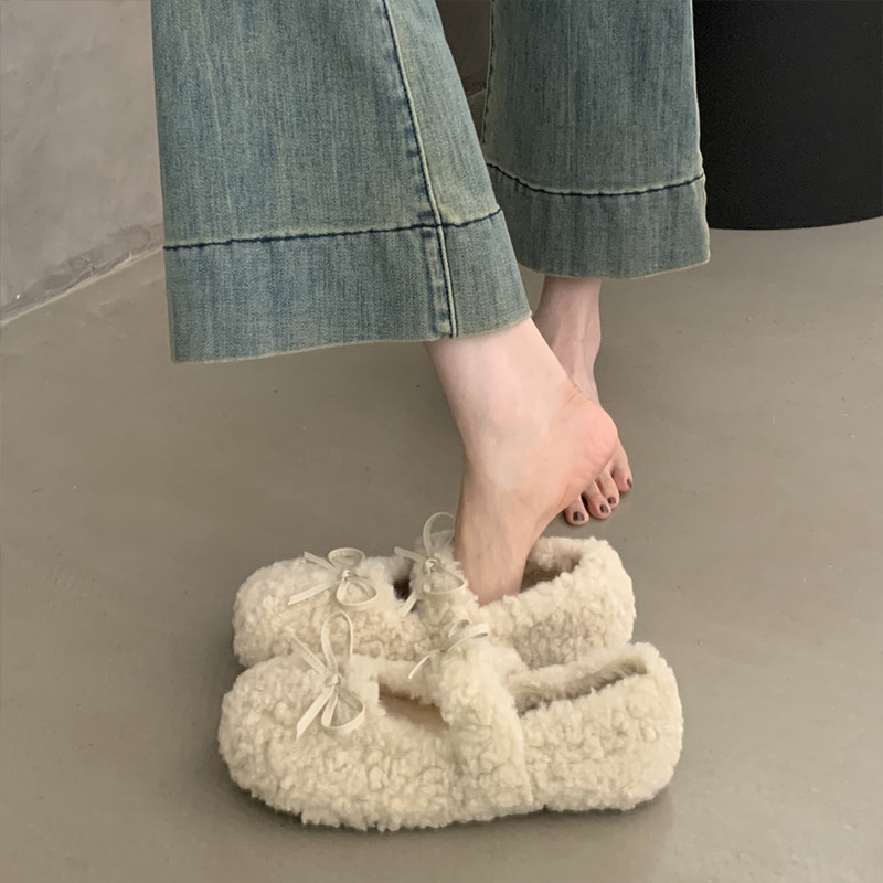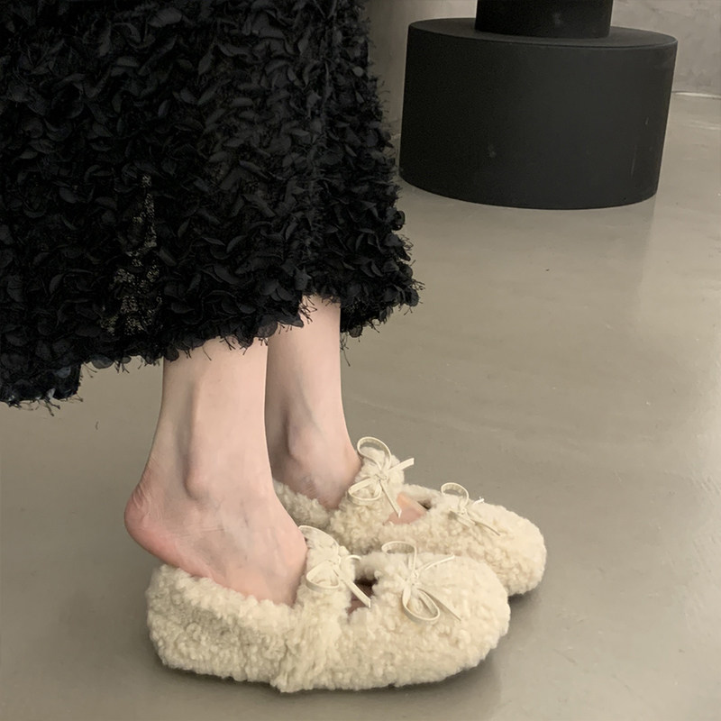 温柔甜美圆头浅口内增高毛毛鞋女秋冬外穿加绒保暖蝴蝶结玛丽珍鞋