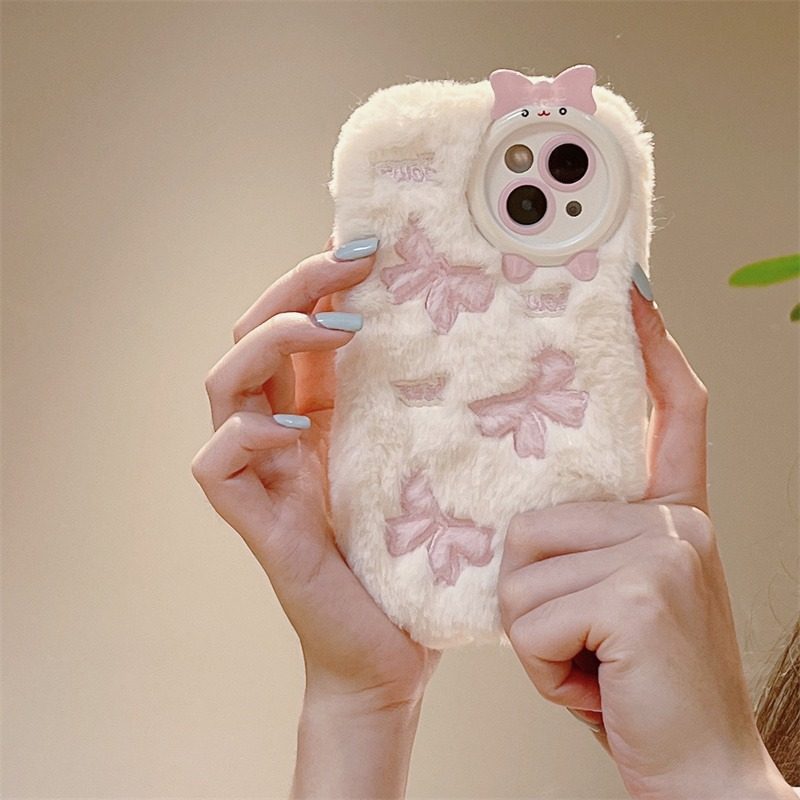 秋冬毛绒刺绣蝴蝶结适用苹果15promax壳iphone14新款13毛茸茸12高级感小众ins防摔全包创意16Plus白色个性11