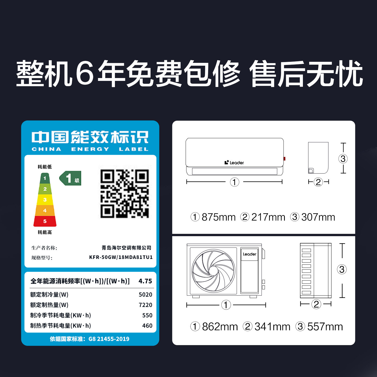 海尔出品统帅空调家用2匹客厅卧室挂机套装热泵超省电一级能效