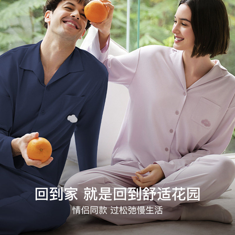 安比斯情侣睡衣舒适纯棉秋季女长袖男女同款休闲家居服套装可出门