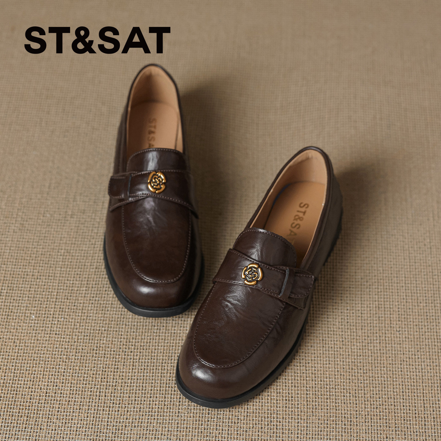 羊皮~棕色山茶花乐福鞋女2025新款通勤粗跟单鞋百搭英伦风小皮鞋