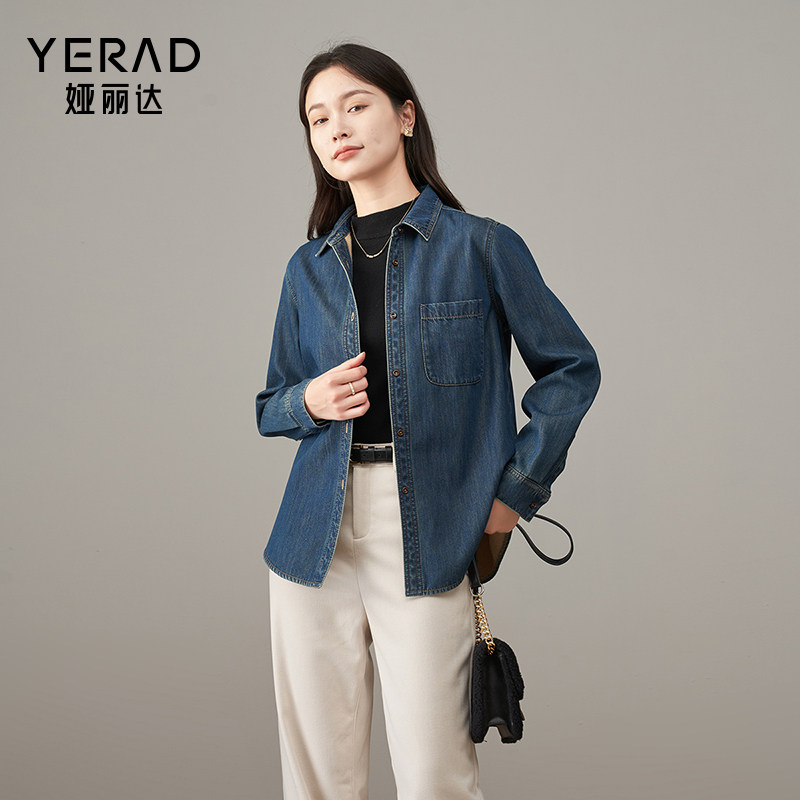 娅丽达简约通勤丹宁加绒牛仔衬衫女2024秋冬新款加厚叠穿外套衬衣