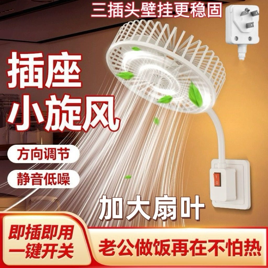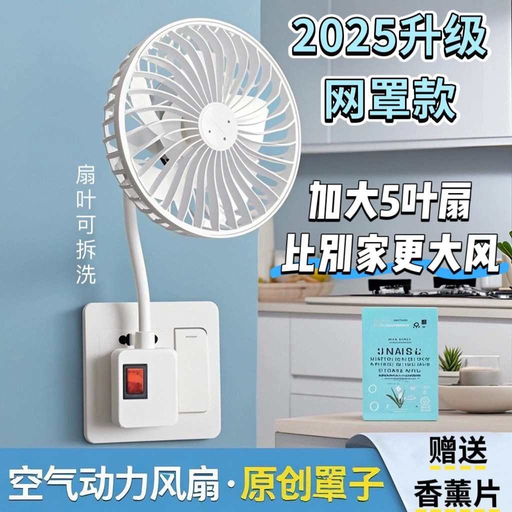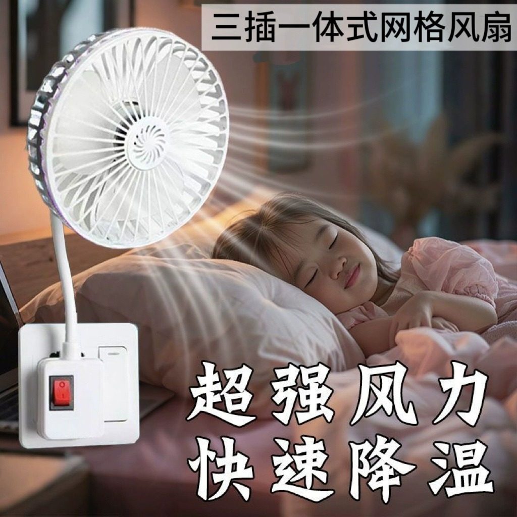 新升级网格插座网罩小风扇厨房厕所家用办公大风力静音三插一体小型吊挂壁扇2025新款