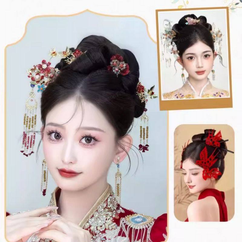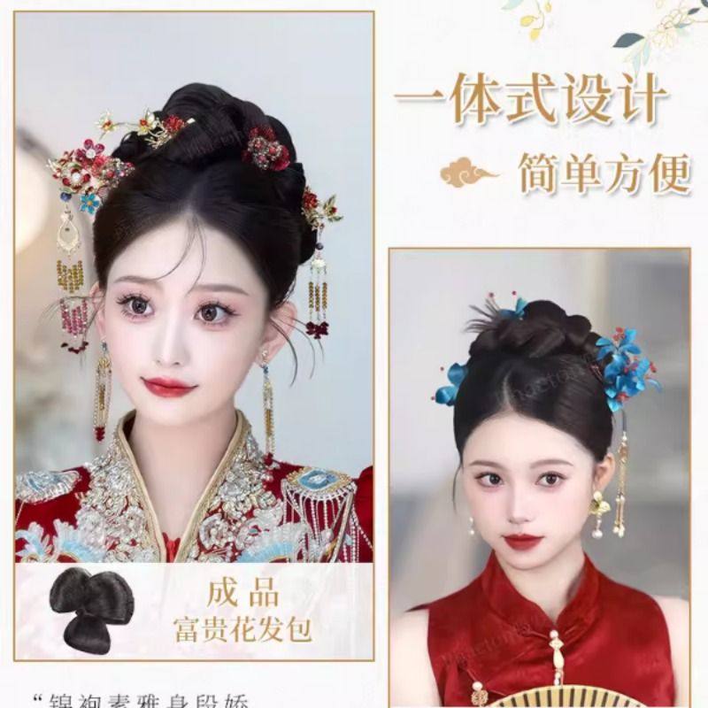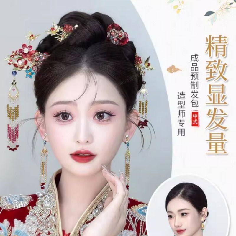新中式丸子头预制手打卷发包新国风秀禾晨袍新娘盘发化妆造型假发