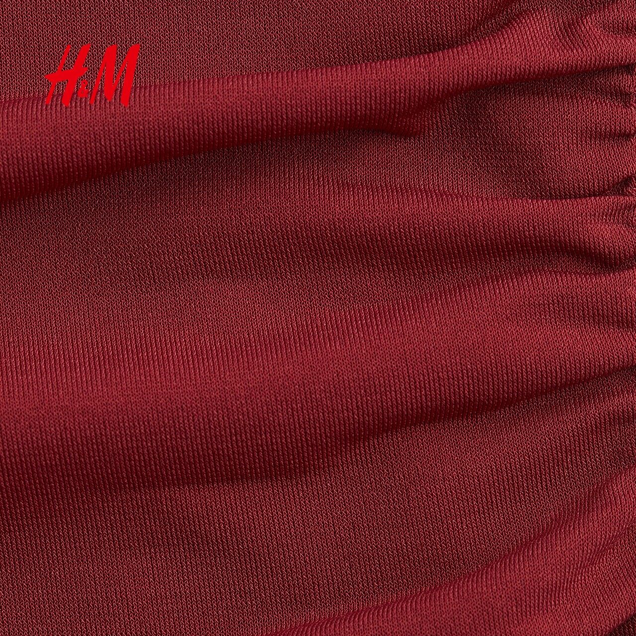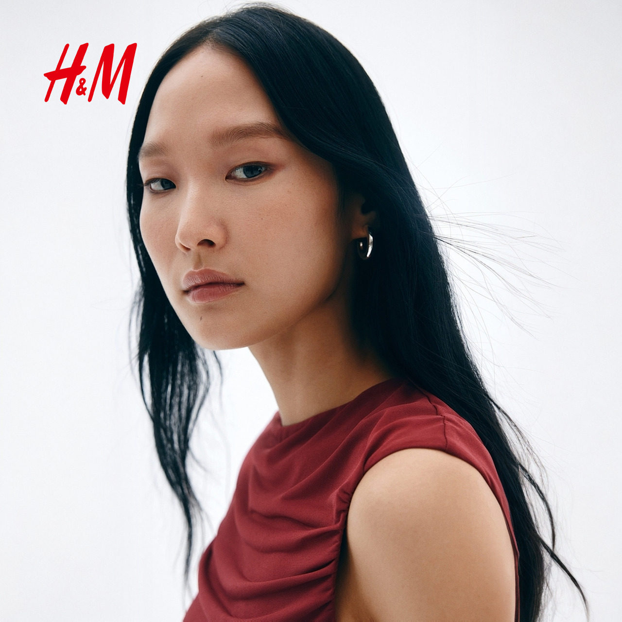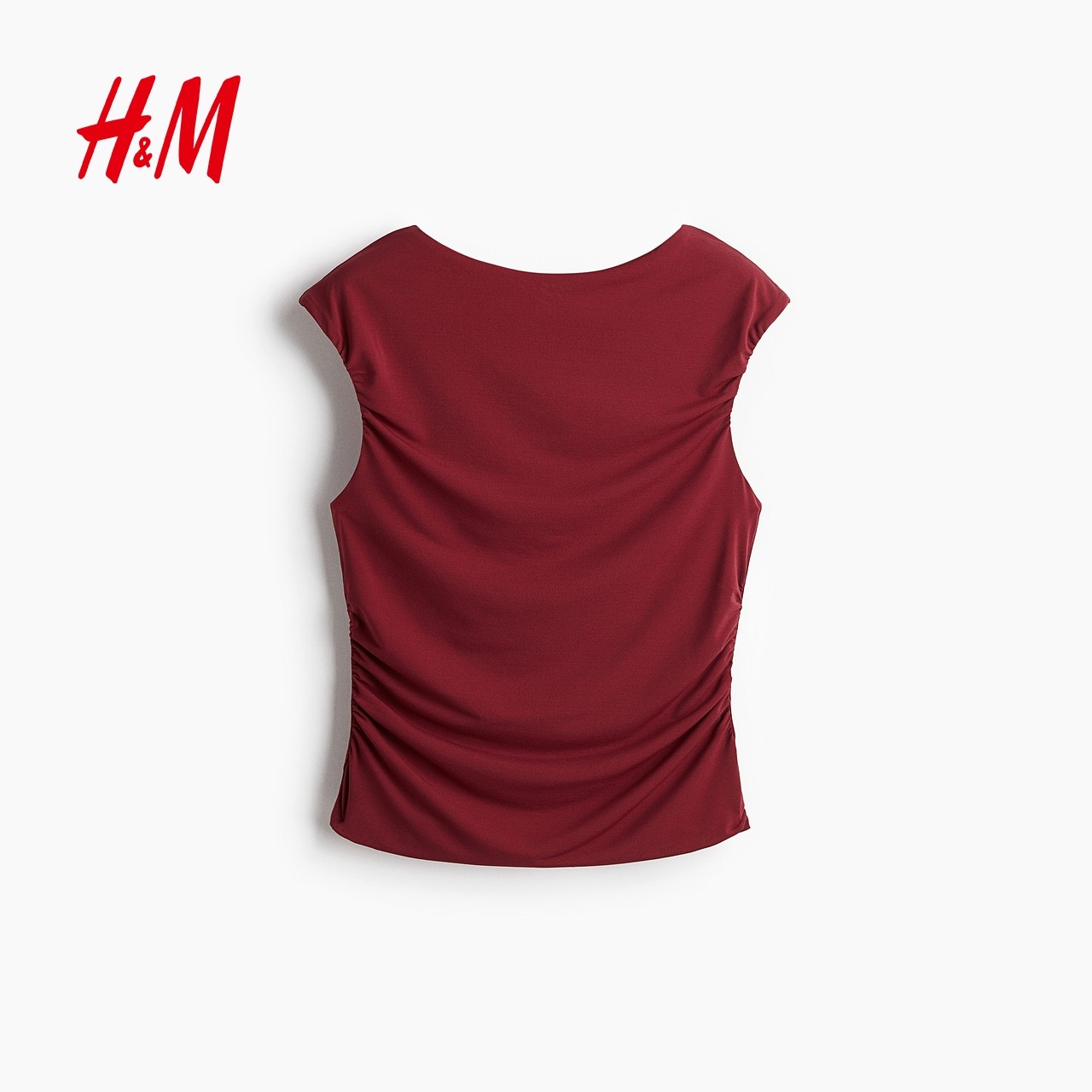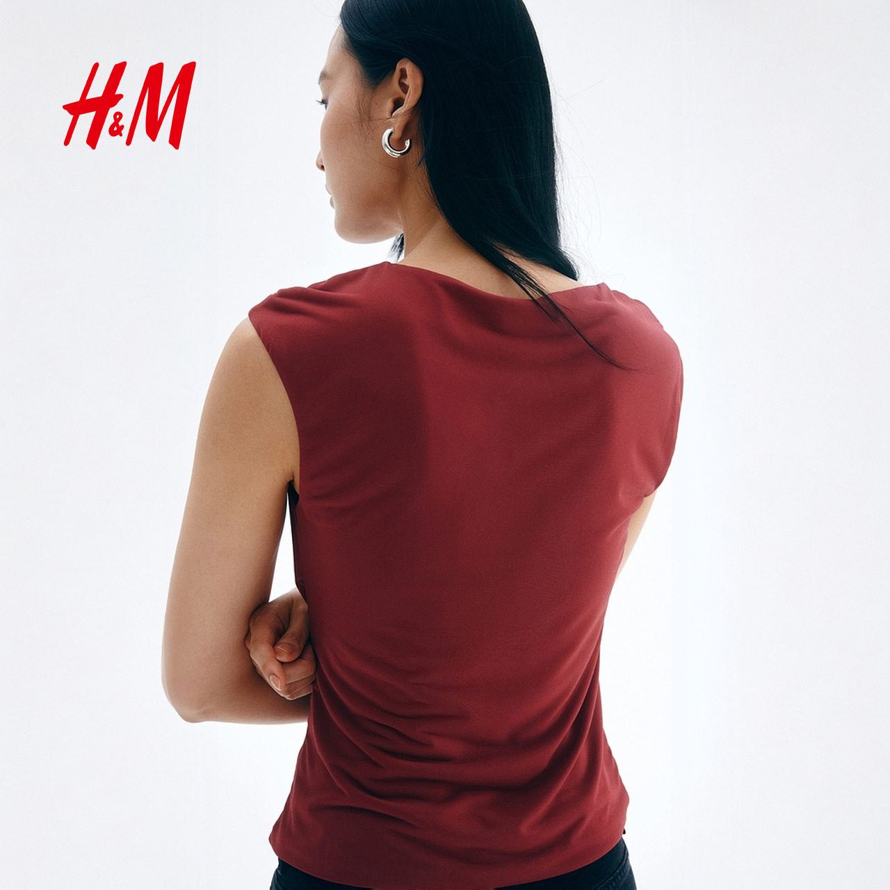 HM女装T恤2025冬季新款修身一字领背心垂褶盖袖酒红色上衣1300538