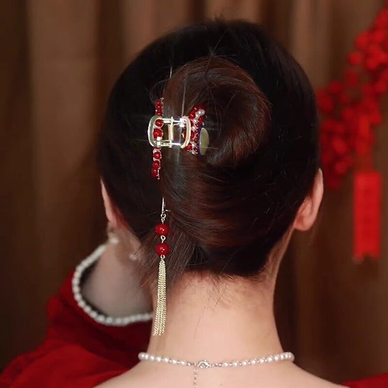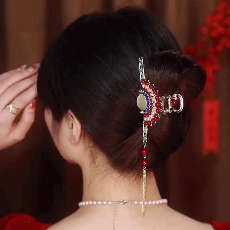 汉服旗袍金属珍珠流苏抓夹中国风2024新款发夹女后脑勺鲨鱼夹头饰