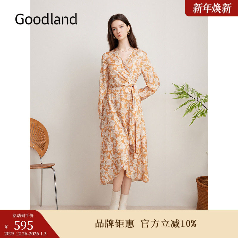 Goodland美地秋季法式朱伊碎花茶歇交叠V领连衣裙