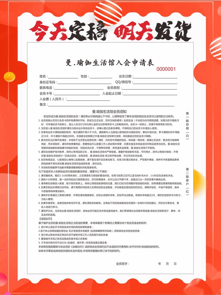 定做健身入会协议私教协议瑜伽会员合同减肥舞蹈培训协议课程收据