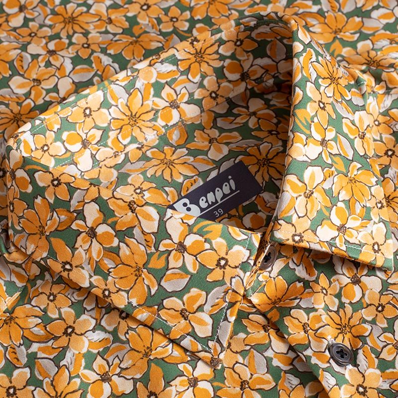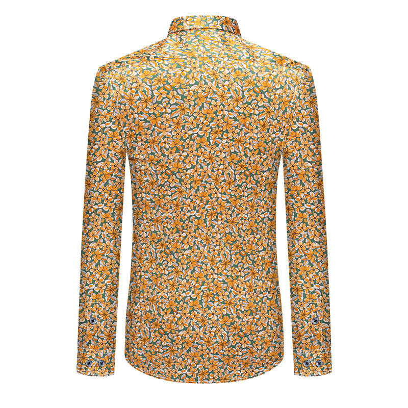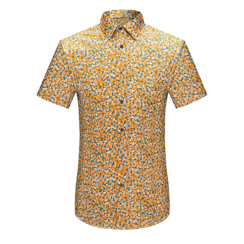 本派衬衫男高级感痞帅男士夏季新款短袖黄色碎花纯棉印花衬衣长袖