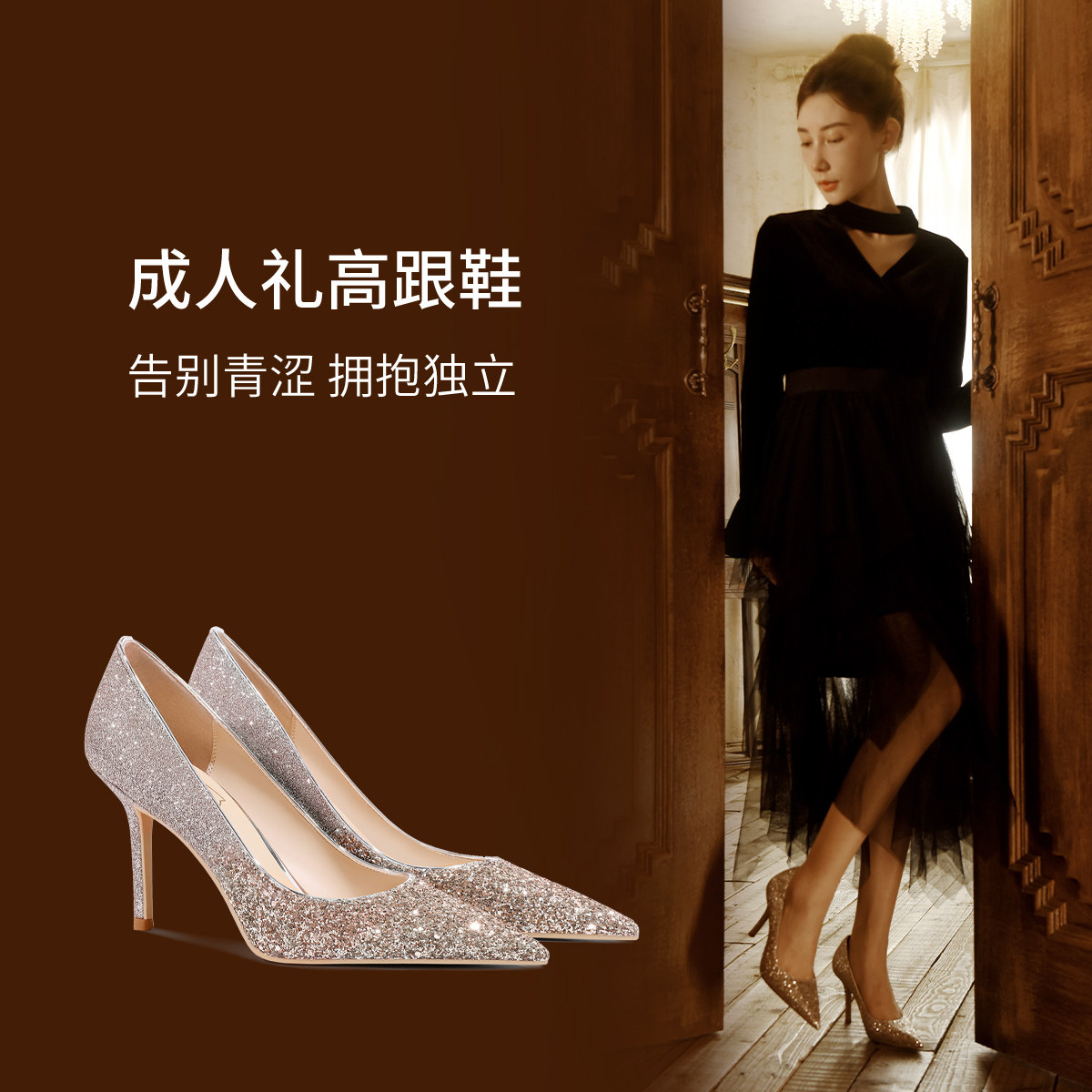 婚鞋女2024年新款主婚纱新娘鞋亮片香槟色水晶鞋尖头细跟高跟鞋女