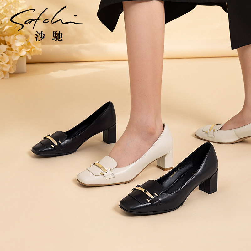 沙驰女鞋小方头粗跟职业通勤鞋女高跟2025年秋季新款舒适羊皮单鞋