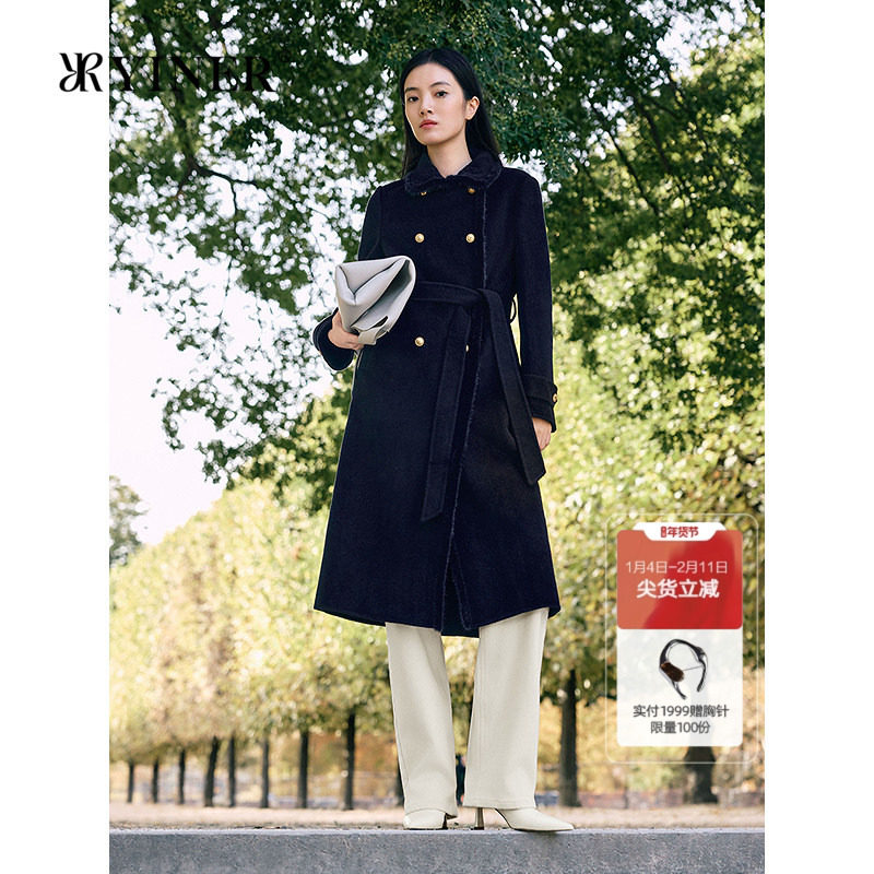 YINER音儿专选2025冬季新款水貂毛条装饰羊毛羊绒混纺双面呢大衣