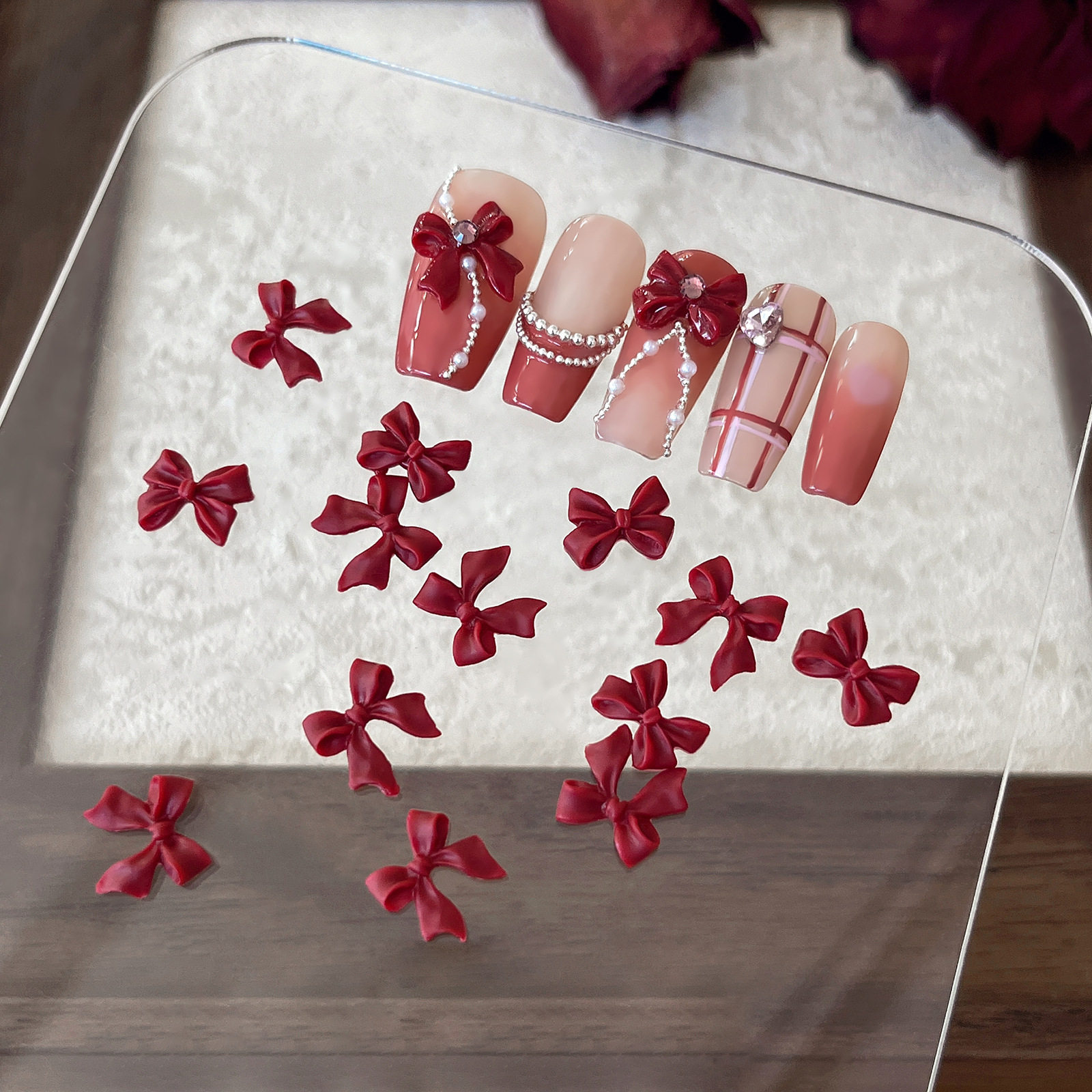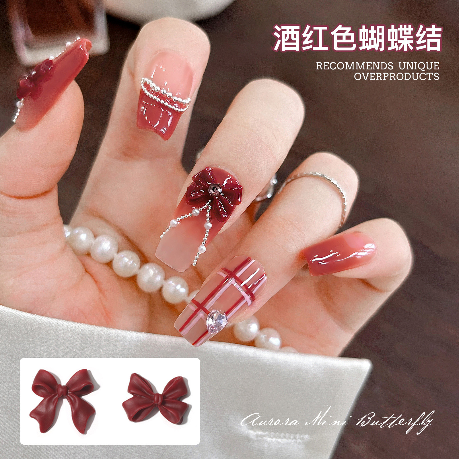 爆款酒红色蝴蝶结美甲饰品甜酷风领结平底磨砂款穿戴甲小装饰