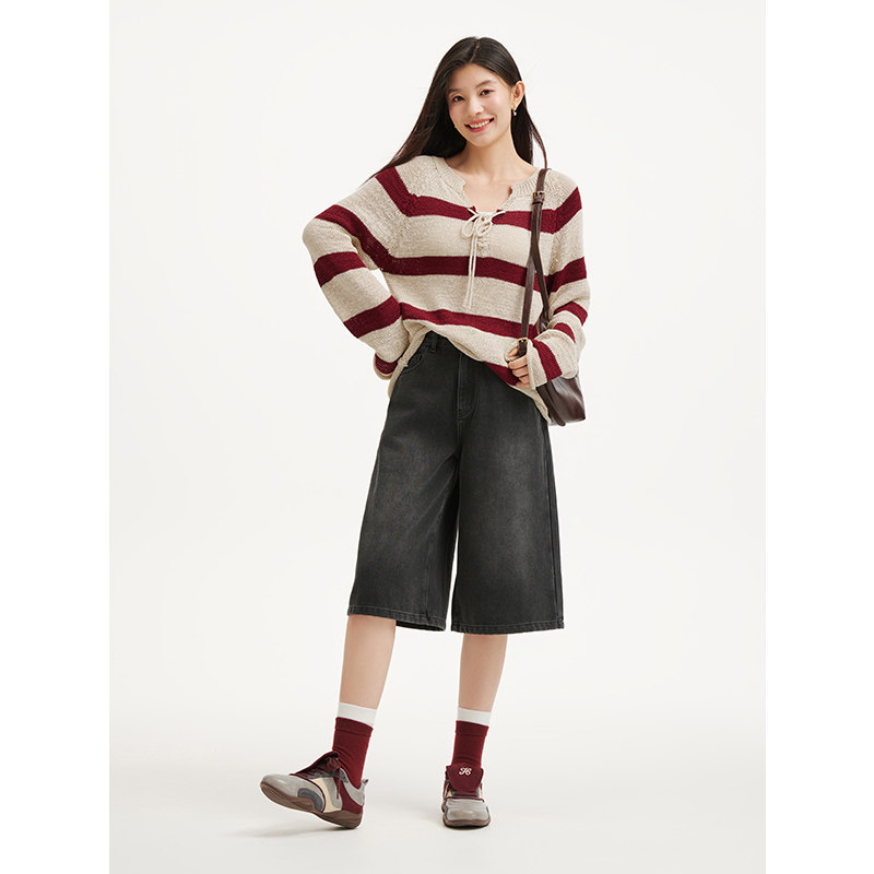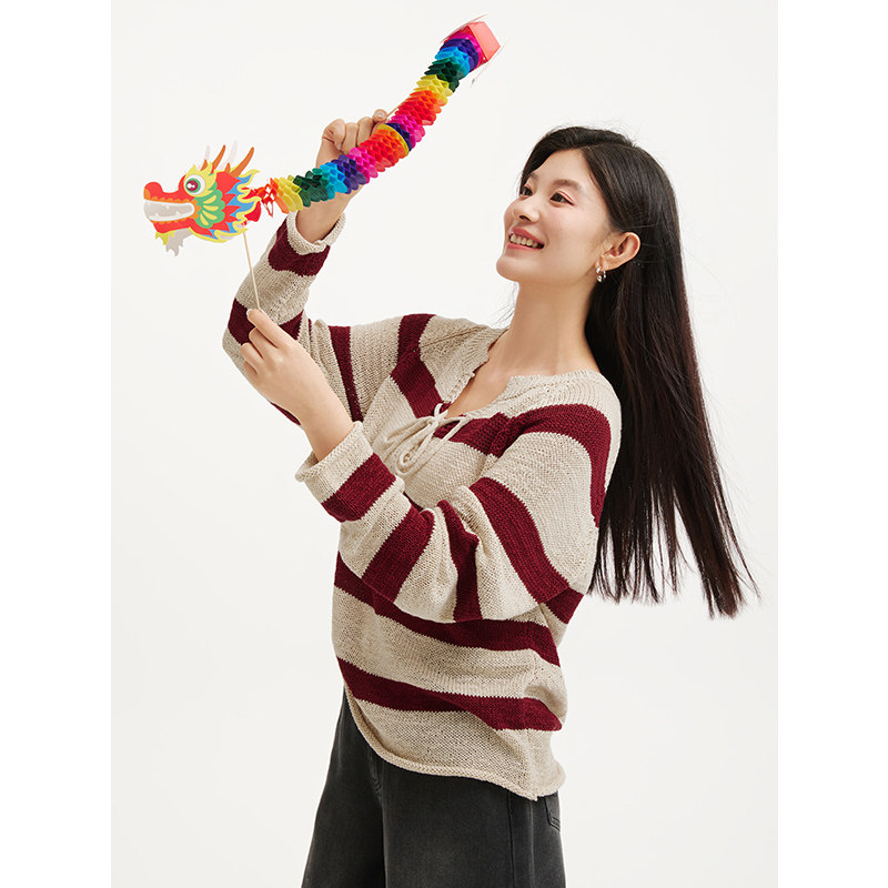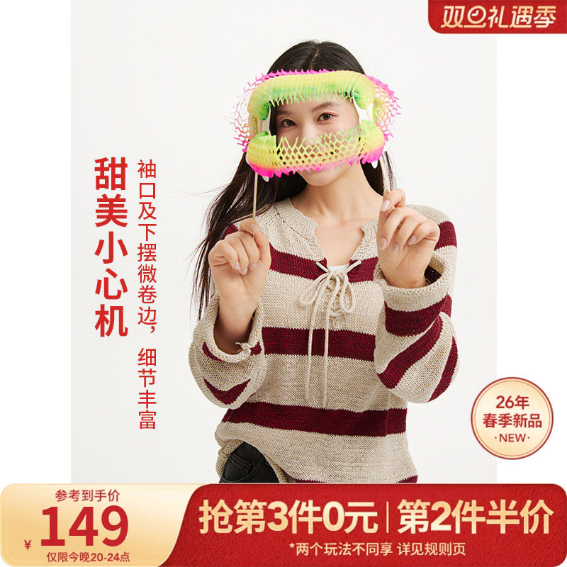 热风2026年春季新款女士休闲系带显层次条纹针织衫温柔风柔软亲肤