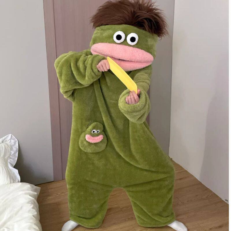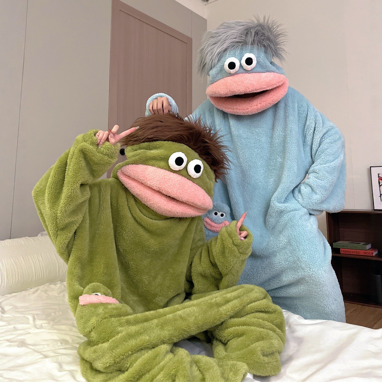 丑萌带大嘴怪睡衣家居服加绒保暖学生党抽象搞怪连体冬季可外穿