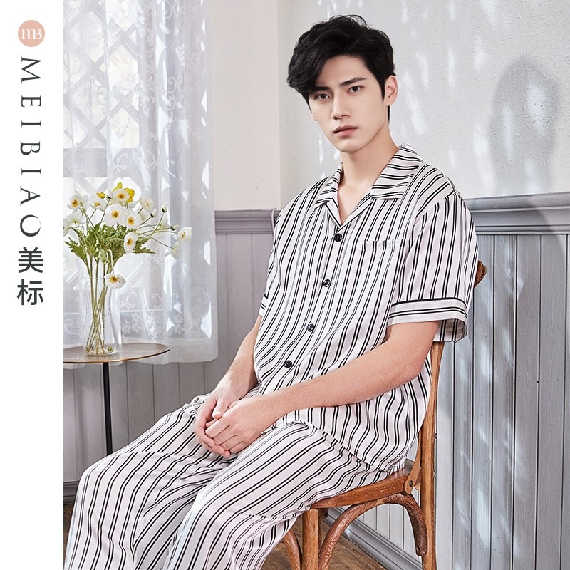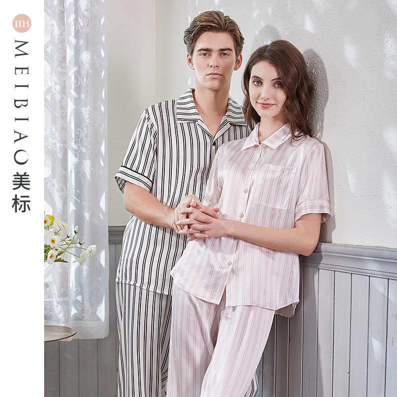 美标短袖真丝睡衣套装春秋桑蚕丝19姆米重磅丝绸可外穿家居服男夏