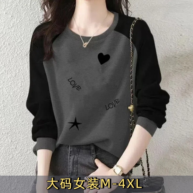 100%纯棉长袖T恤上衣女春秋季大码宽松遮肉显瘦套头外穿拼接卫衣F