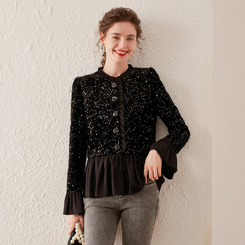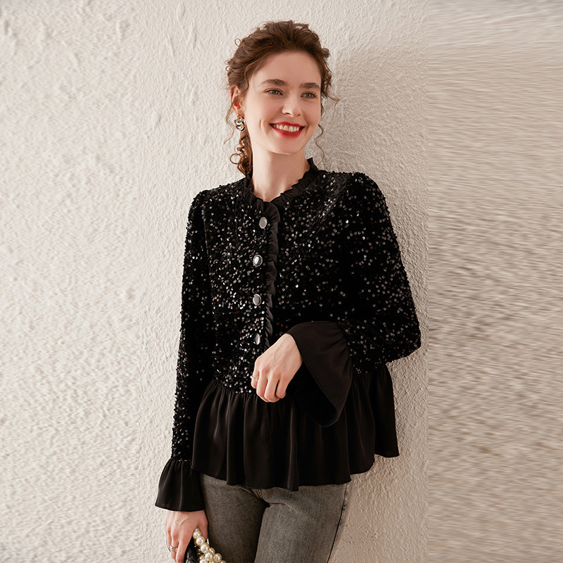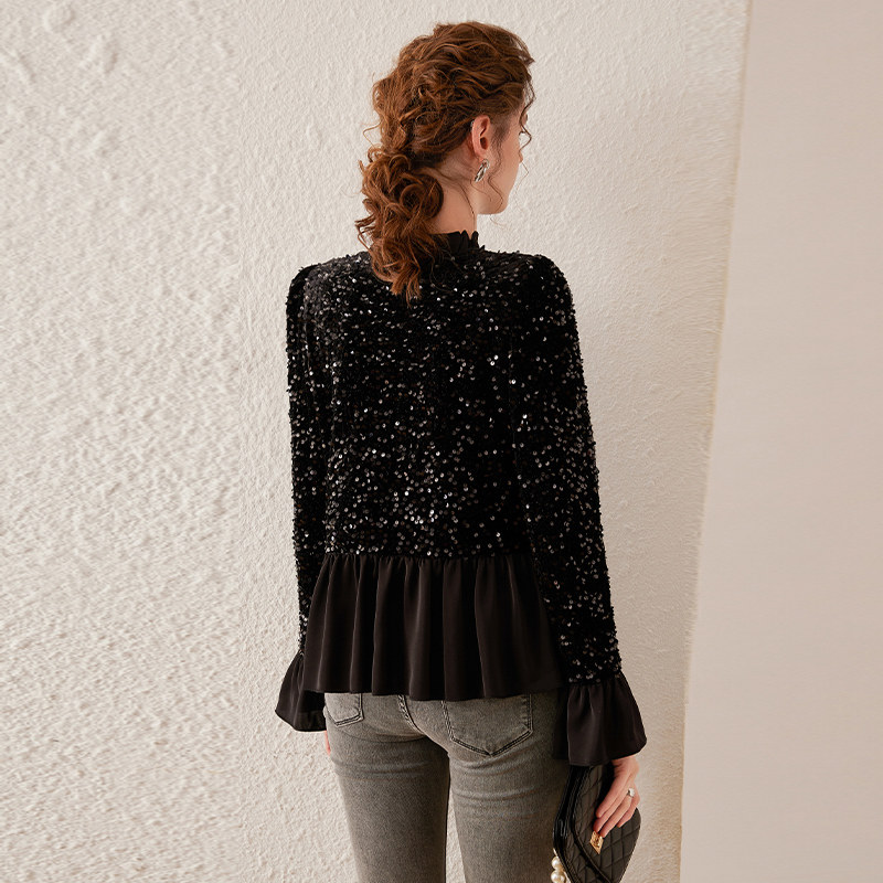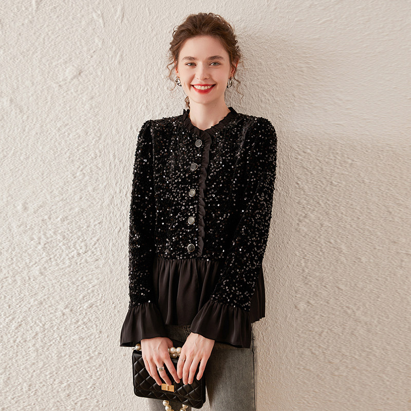 优雅重工亮片 丝绒上衣 复古拼接木耳边