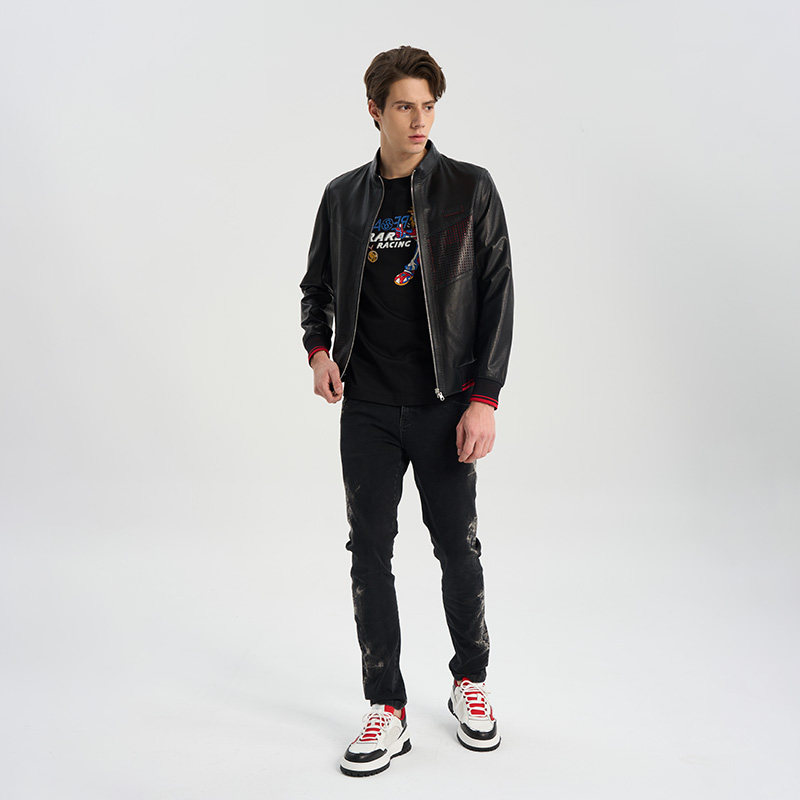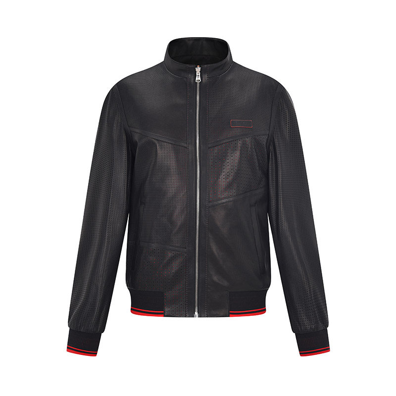 RARE威雅男装春夏新款“發”字冲孔拼接设计黑色立领皮衣外套