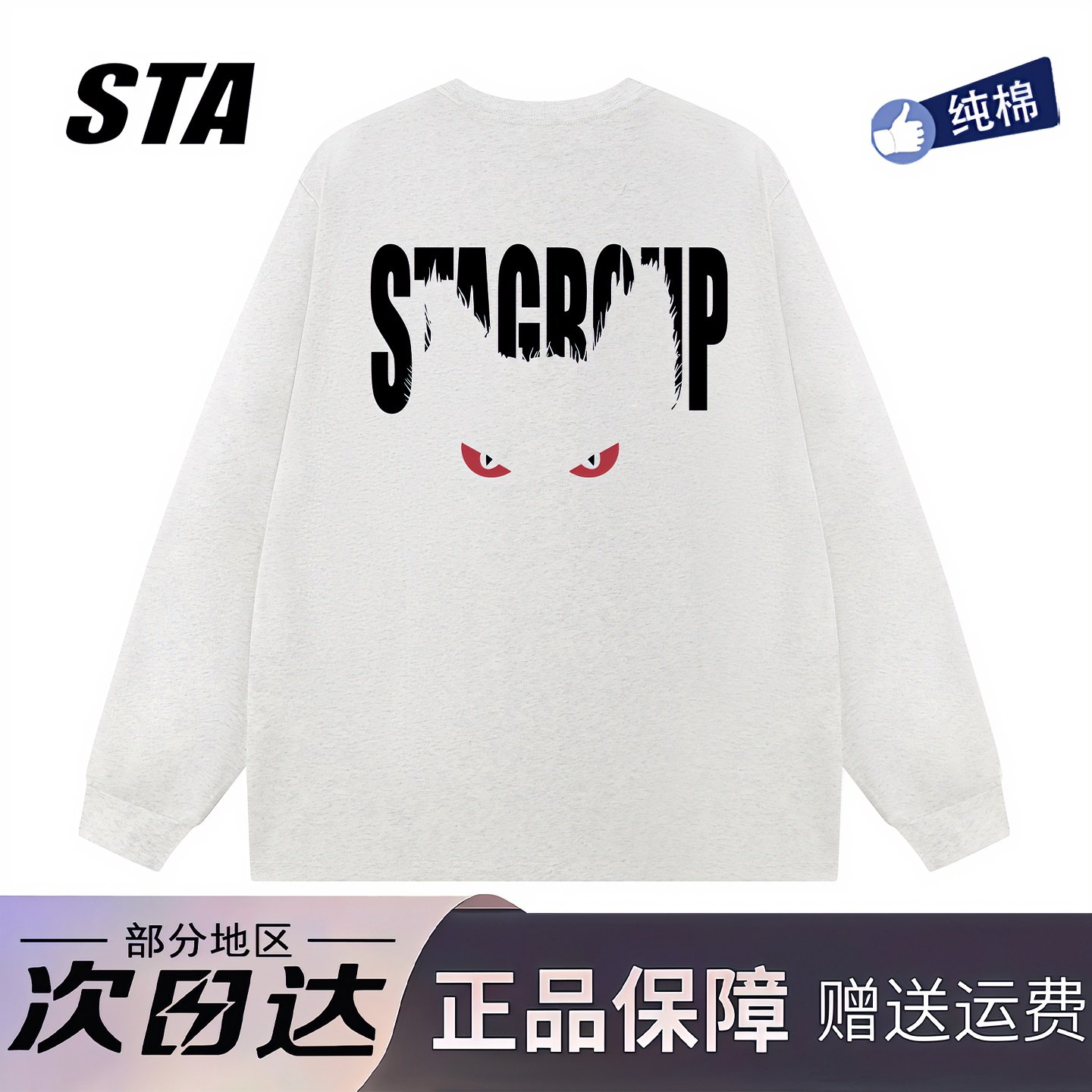 STA旗舰店美式潮牌纯棉重磅长袖t恤男女秋季搞怪猫眼印花情侣卫衣
