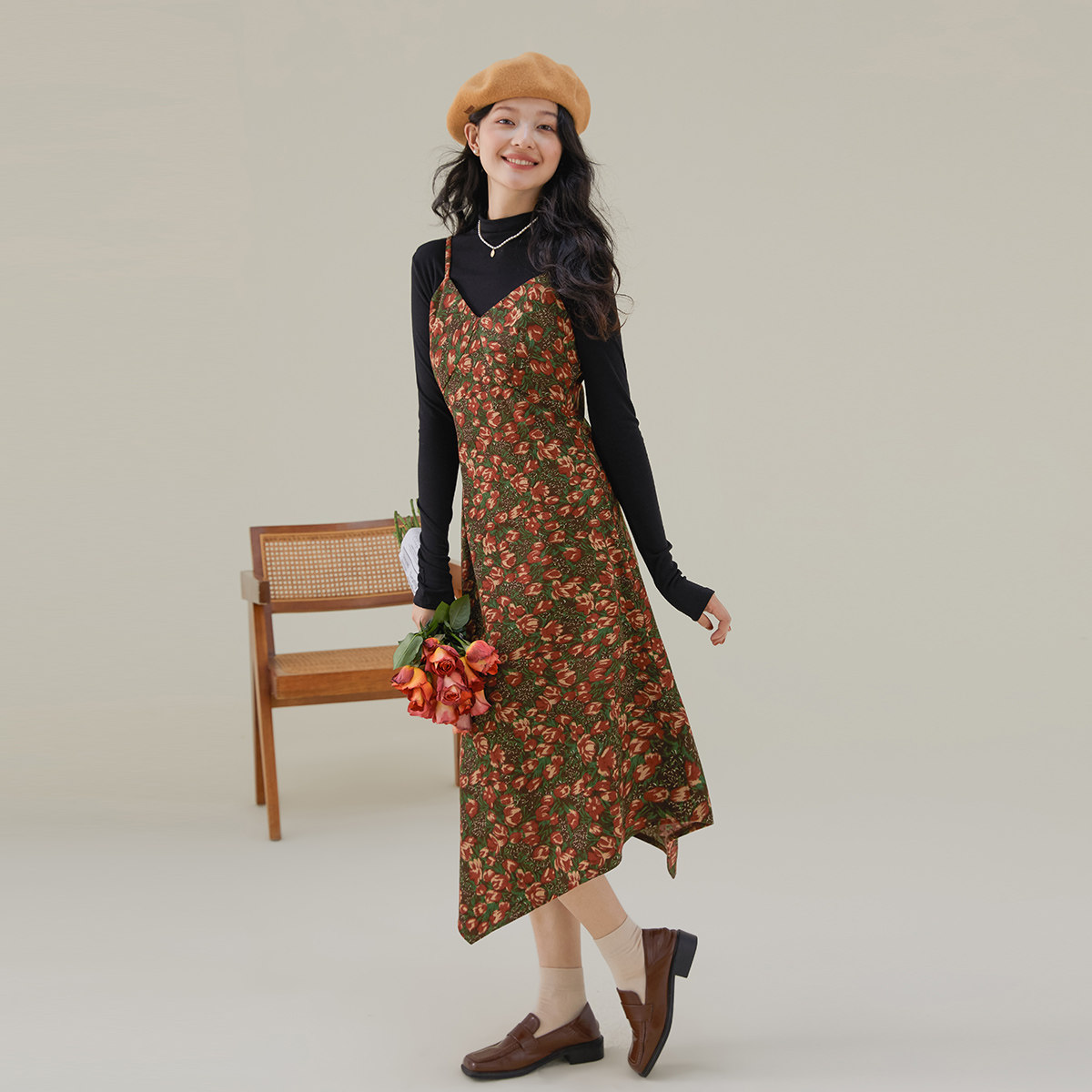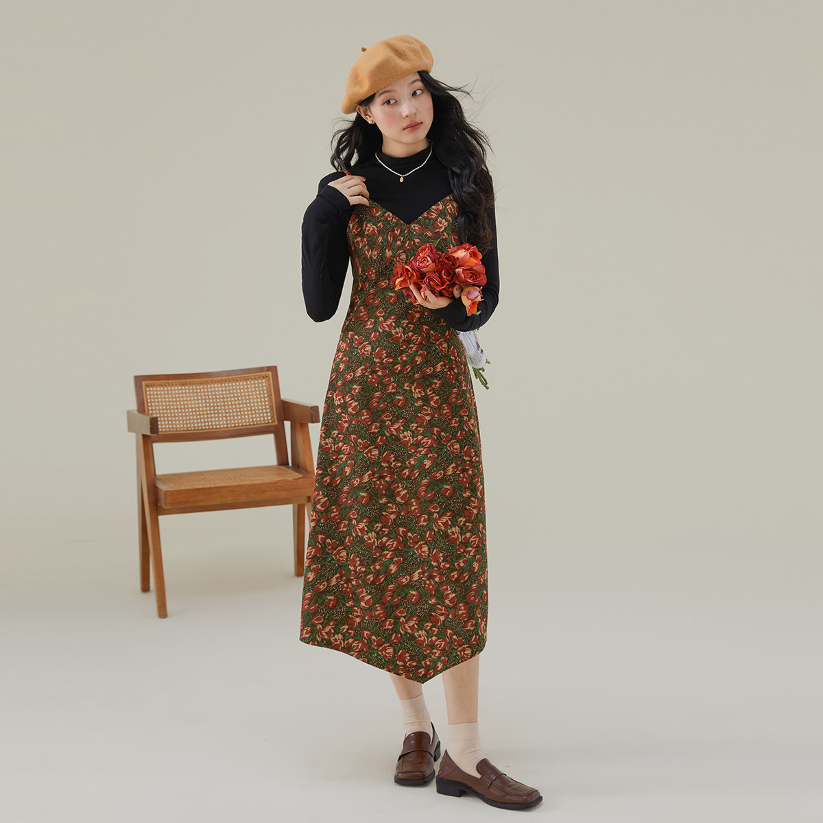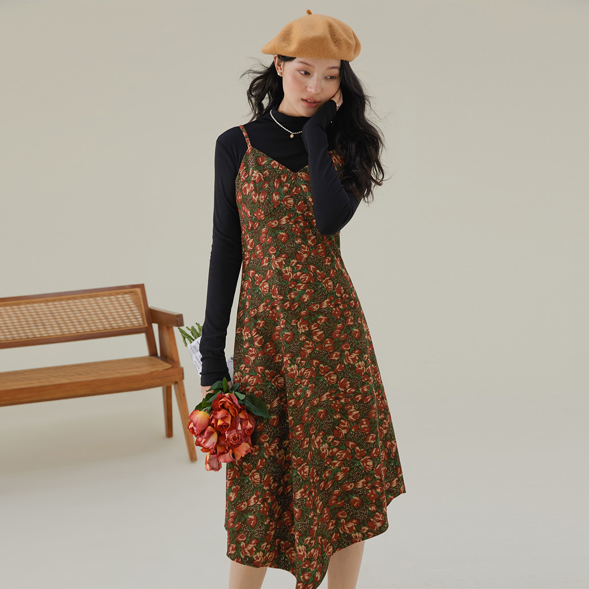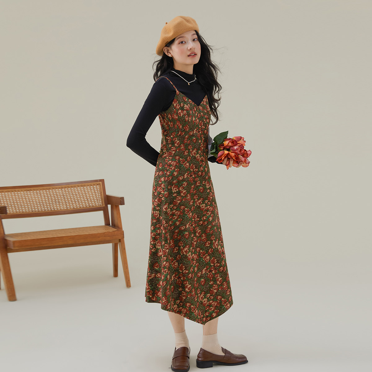 one more2025秋季背带裙吊带灯芯绒连衣裙高级感女油画碎花裙气质
