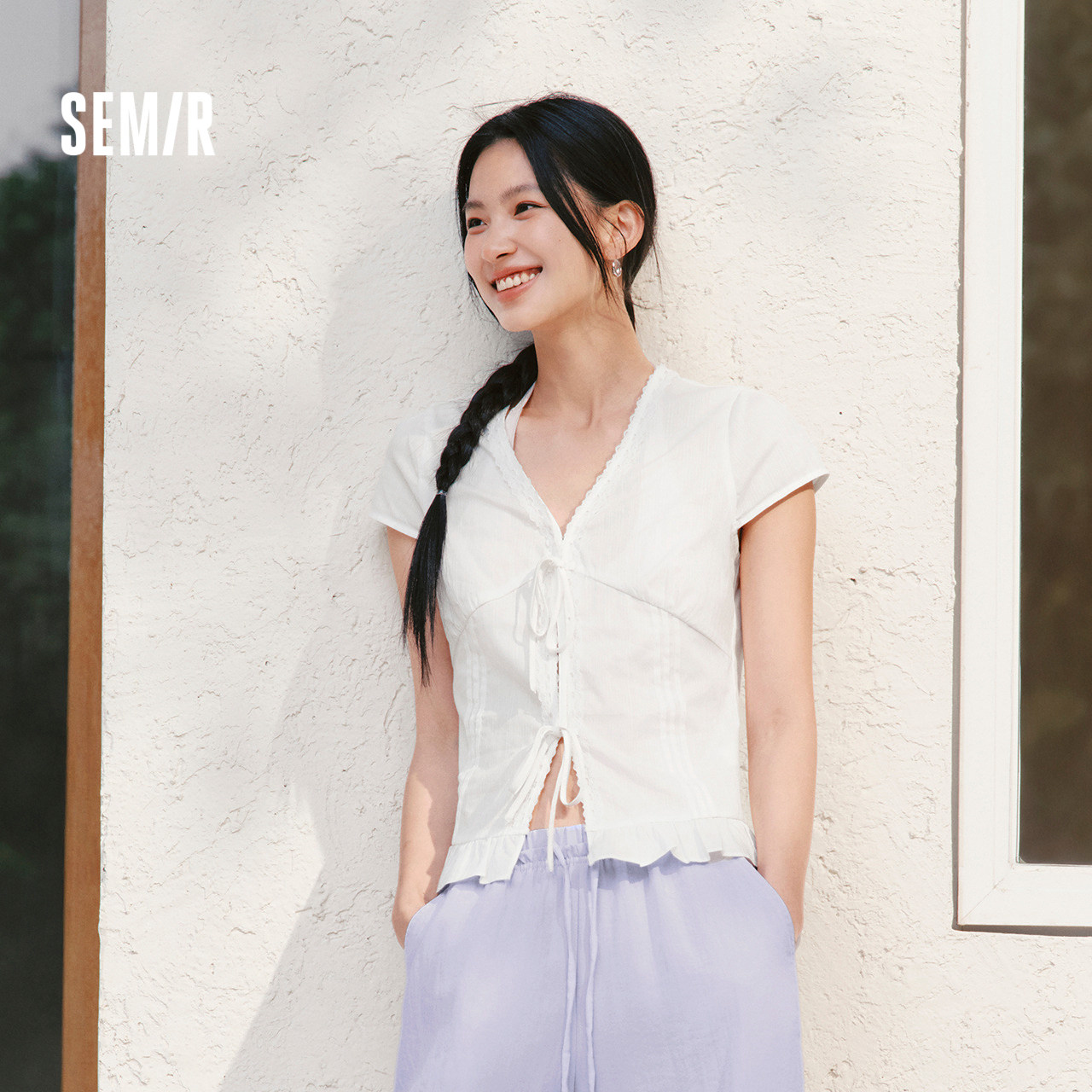 森马短袖衬衫女夏季短款V领蝴蝶结纯棉修身2026新款甜美俏皮衬衣
