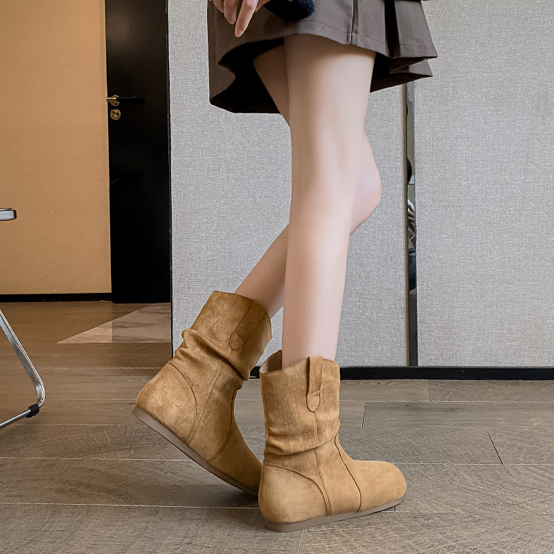 真皮~内增高西部牛仔堆堆靴女2025秋褶皱裤管短靴复古骑士马丁靴