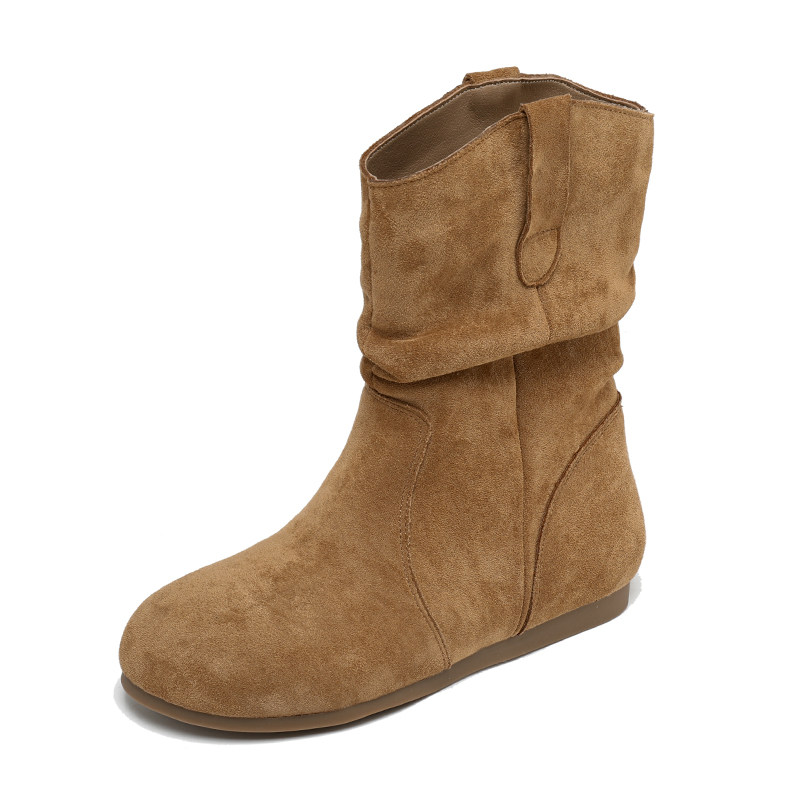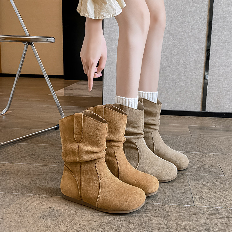 羊皮版~内增高靴子女2025新款爆款中筒粗跟短靴卡其色褶皱堆堆靴
