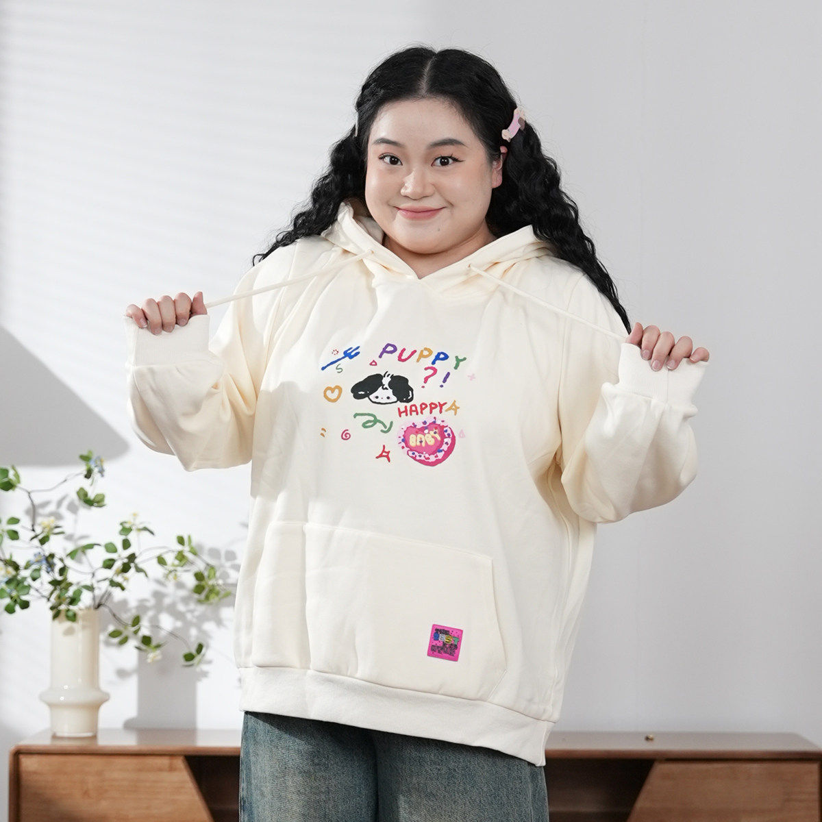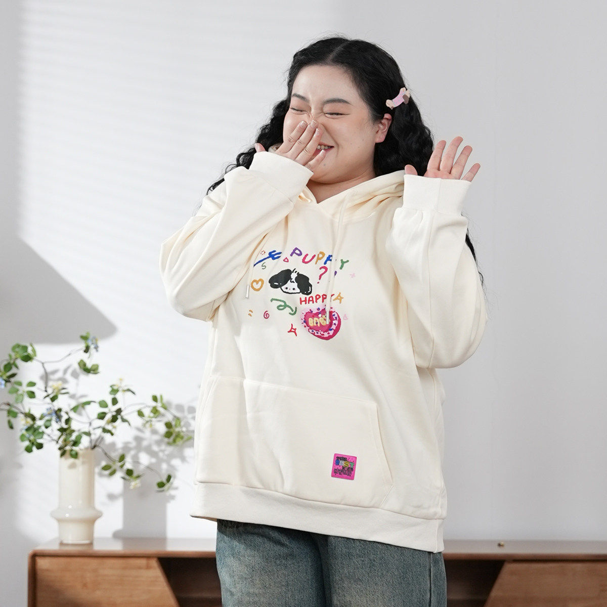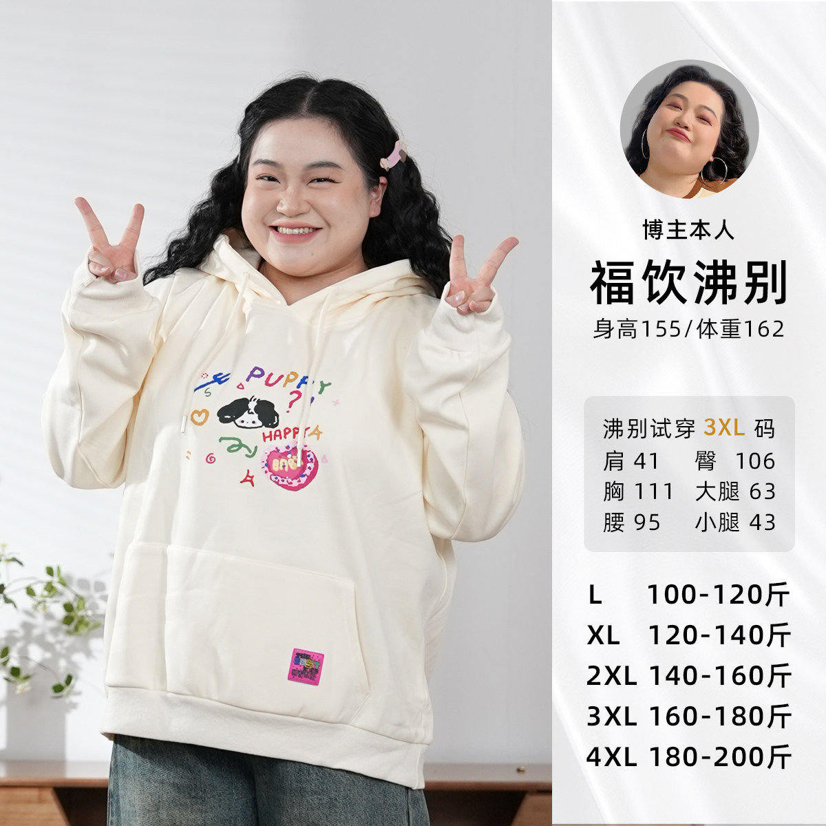福饮沸别【爱心小狗】大码休闲百搭冬季加绒保暖印花连帽卫衣2037