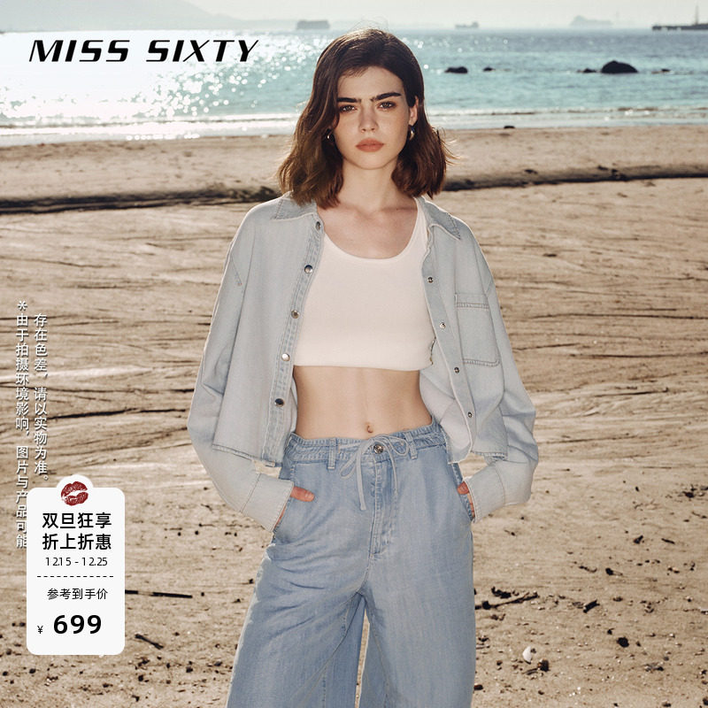 Miss Sixty牛仔衬衫女翻领美式复古简约长袖单排扣短款外搭外套