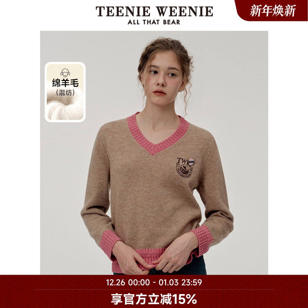 TeenieWeenie小熊奥莱女装毛衣冬季V领撞色羊毛混纺针织衫