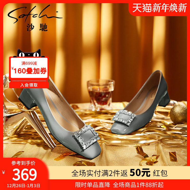 沙驰女鞋水钻方扣职业工作鞋春秋季新款漆皮时尚粗跟中跟单鞋女