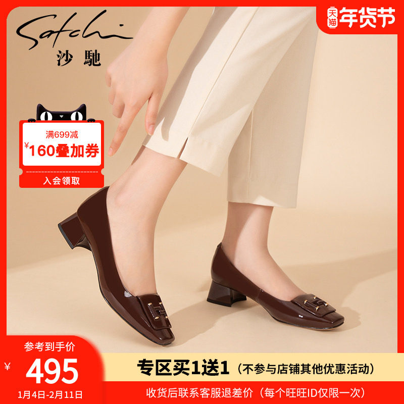沙驰女鞋春秋季浅口职业鞋女新款低中跟粗跟正装单鞋漆皮通勤鞋子