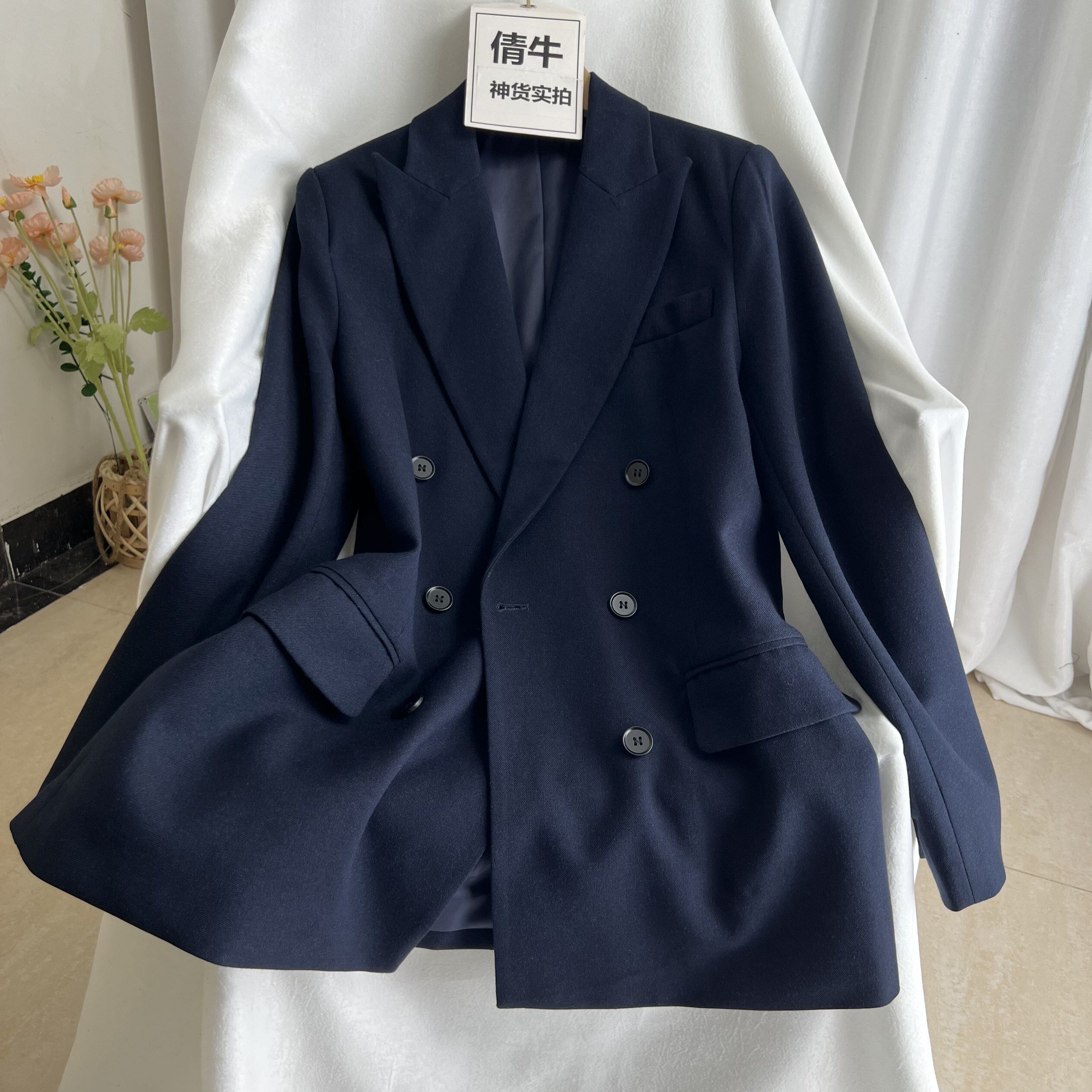 倩牛高端】高级感宽松大气双排扣春装新款羊毛加厚西装套装藏青女