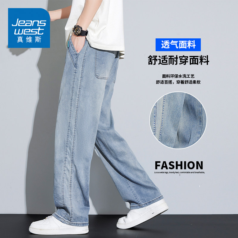 KZH真维斯天丝牛仔裤男秋季新款宽松直筒裤浅色潮牌透气阔腿长裤