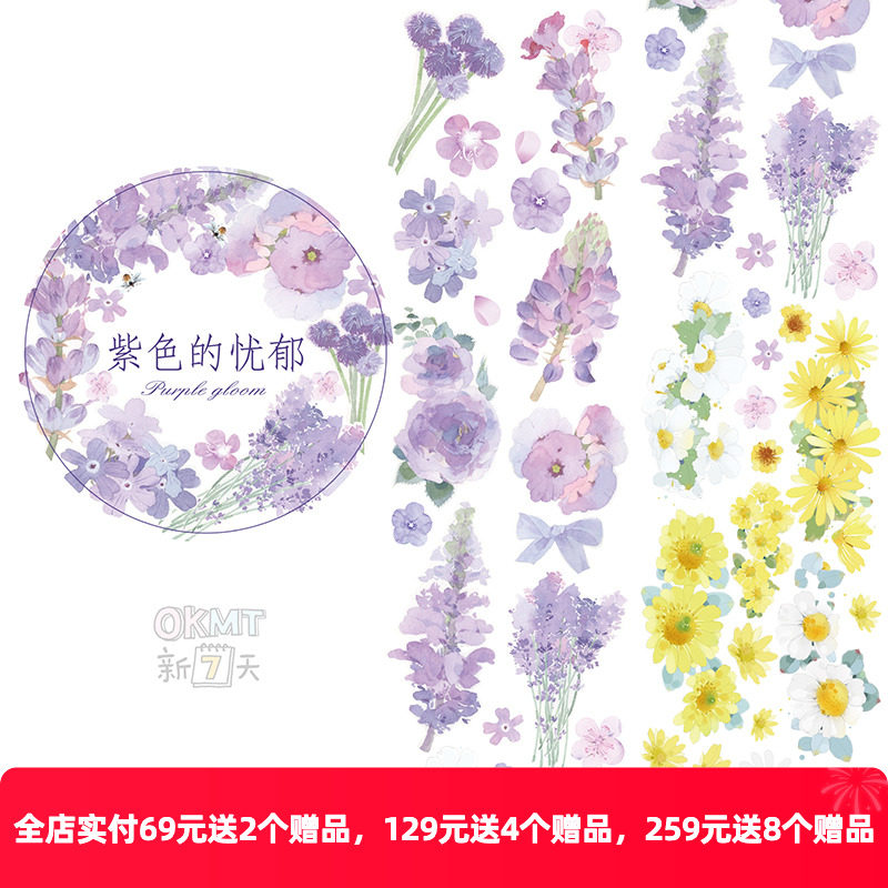 OKMT新七天PET胶带原创手帐花卉装饰贴纸紫色的忧郁小雏菊网红款