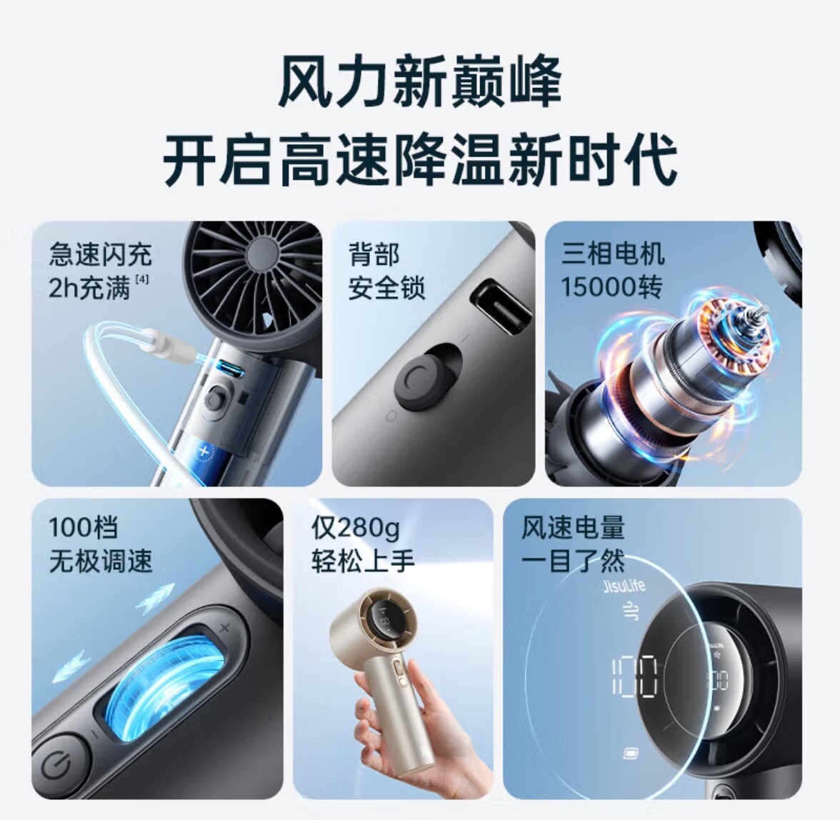 几素Pro1s高速大风手100档持电风扇Jisulife便携USB充电随身Pro1S