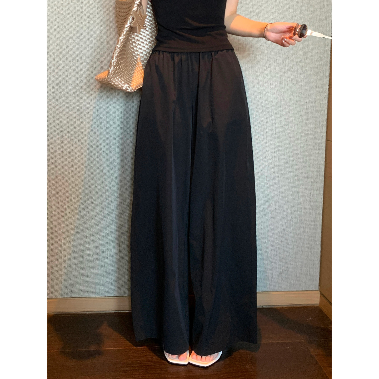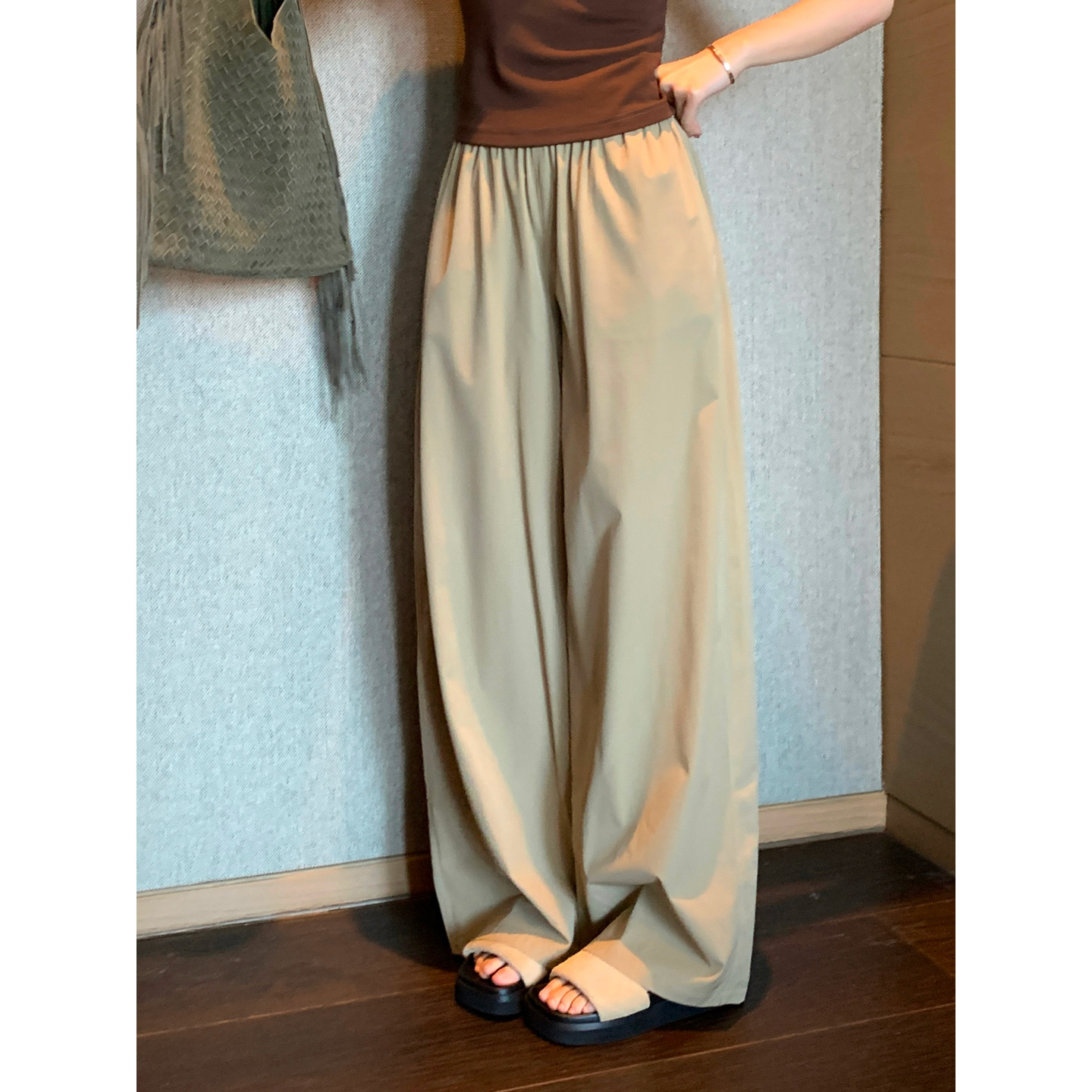 双侧带口袋棉绸绵绸人造棉高腰显瘦直筒裤女宽松休闲百搭阔腿长裤