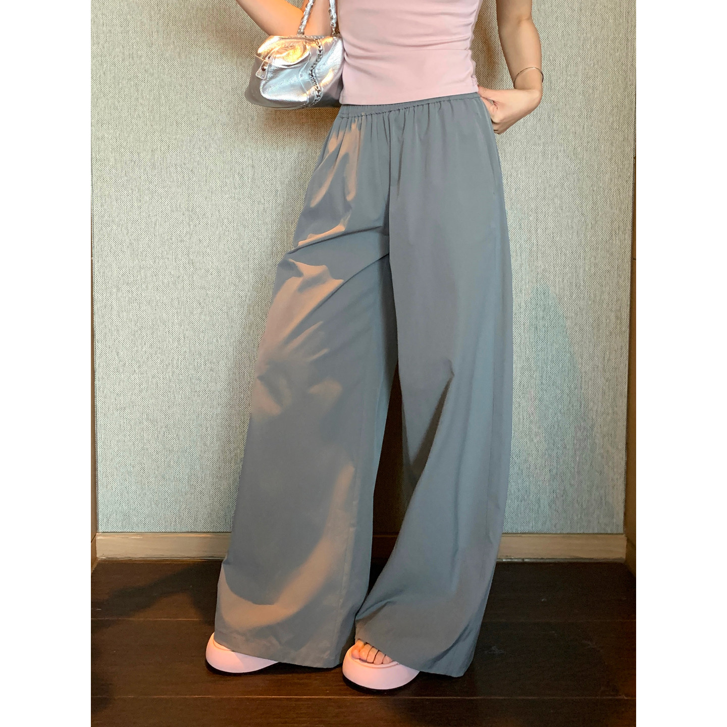 灰色运动裤女小个子2026春季松紧腰运动卫裤高腰垂感阔腿裤束脚裤