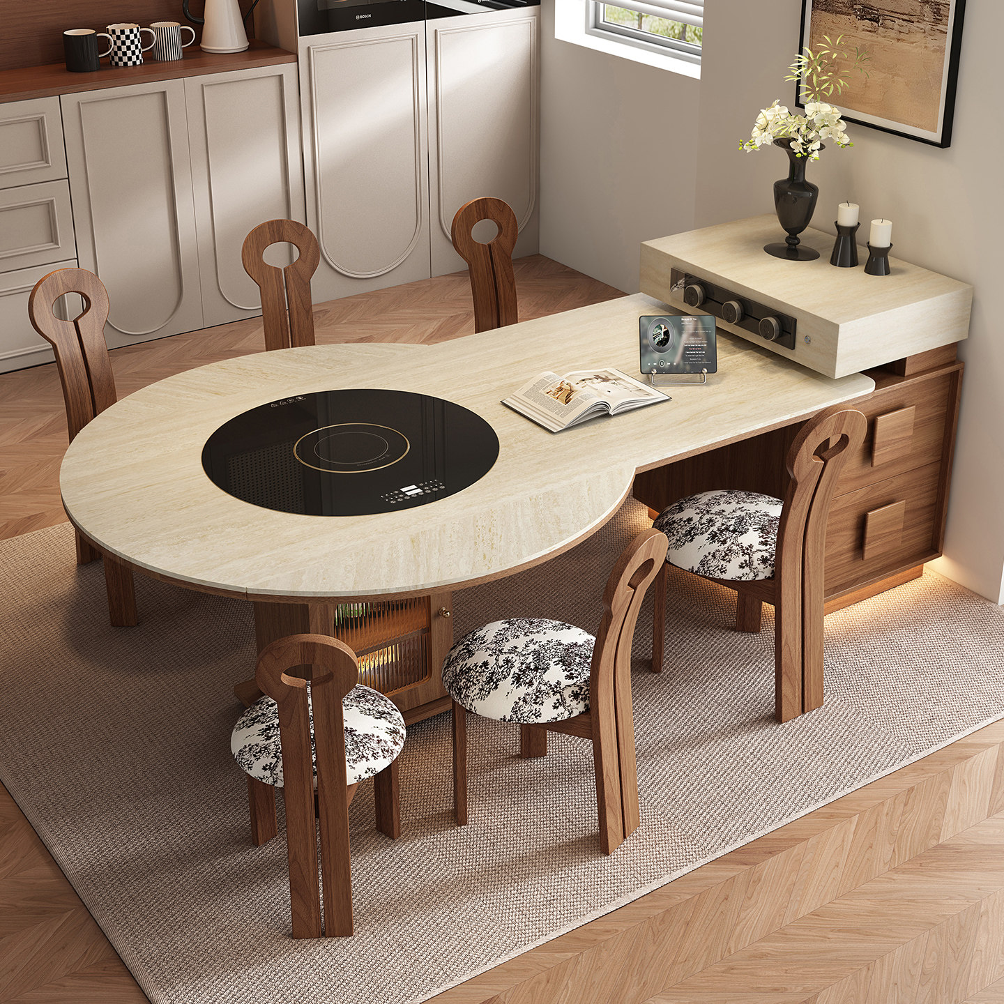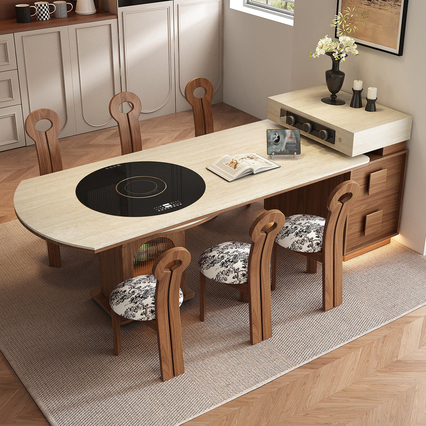 新款中古风圆形岛台餐桌一体家用客厅可伸缩小户型厨房多功能导台