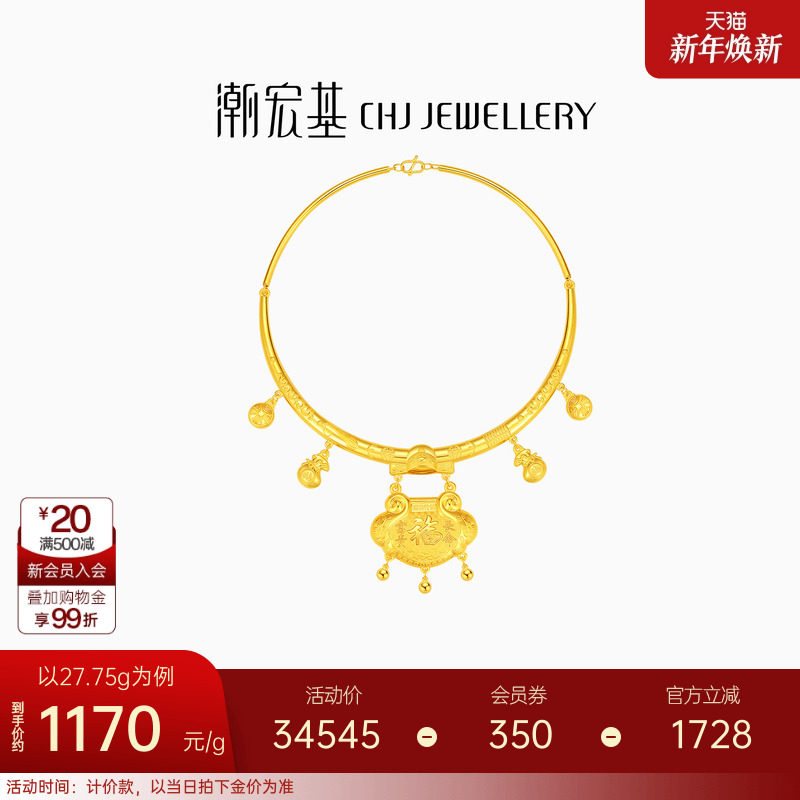 潮宏基传家宝足金项圈黄金颈饰长命富贵锁宝宝新生周岁礼物 计价