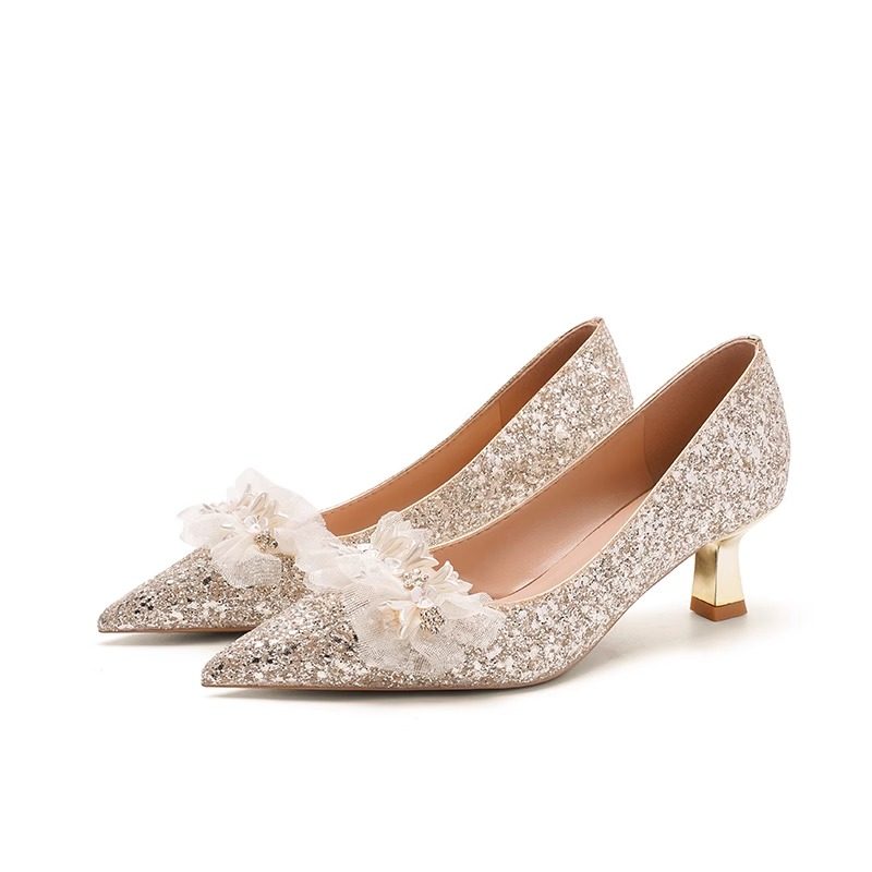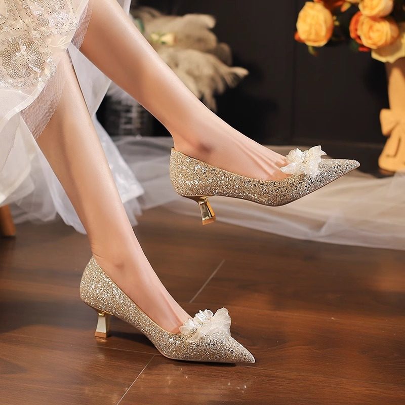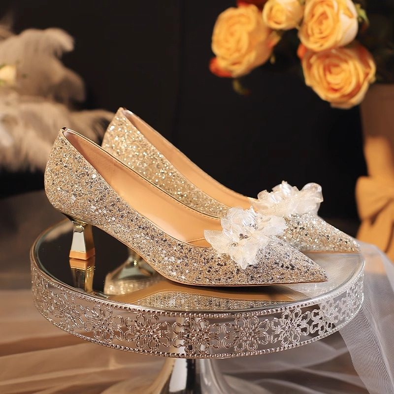 婚鞋女2024年新款主婚纱新娘鞋亮片香槟色水晶鞋尖头细跟高跟鞋女