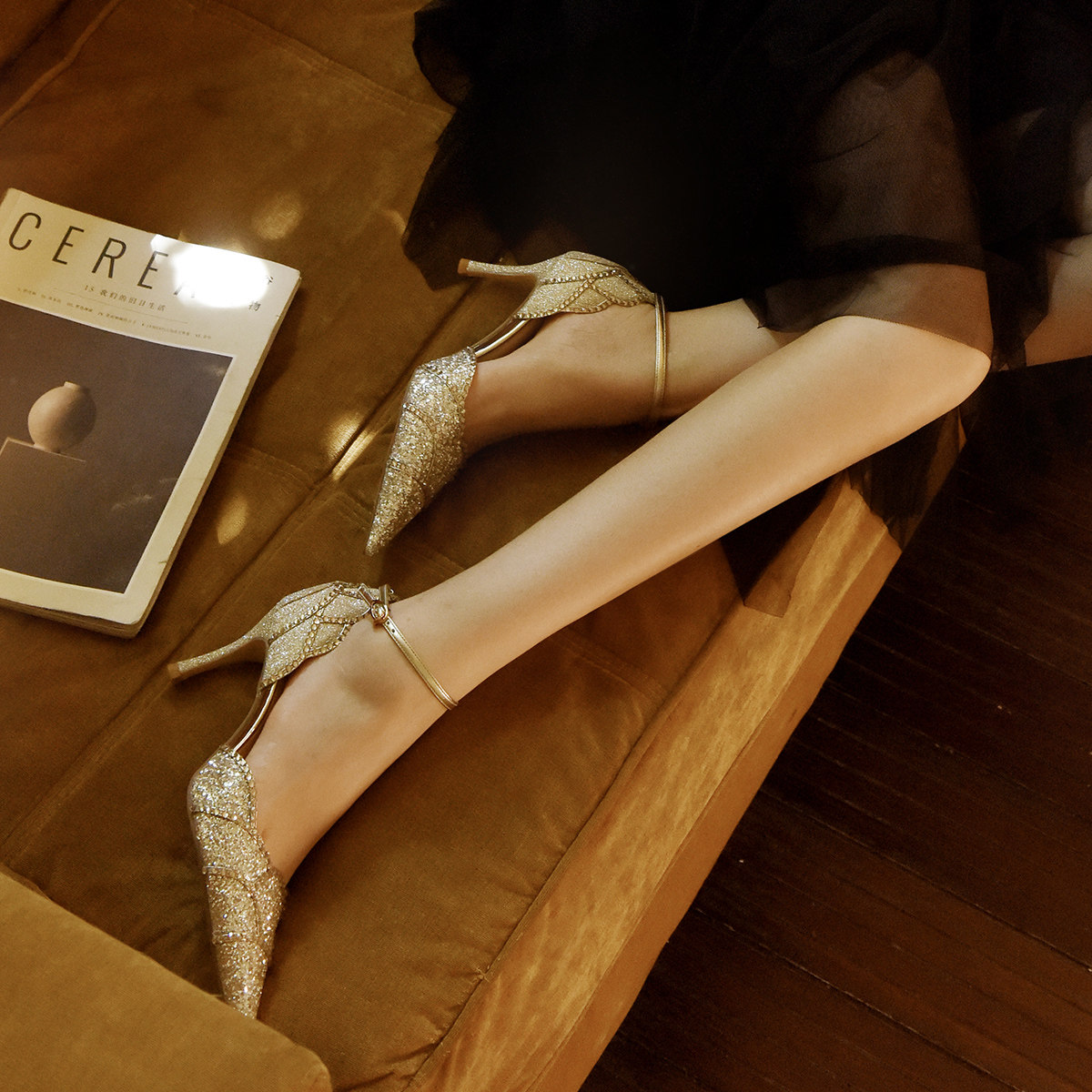 婚鞋女2024年新款主婚纱新娘鞋亮片香槟色水晶鞋尖头细跟高跟鞋女