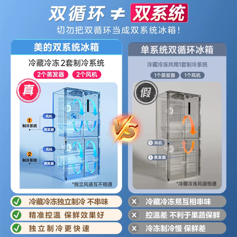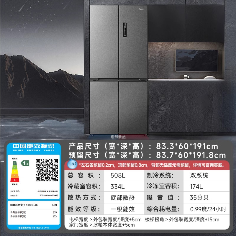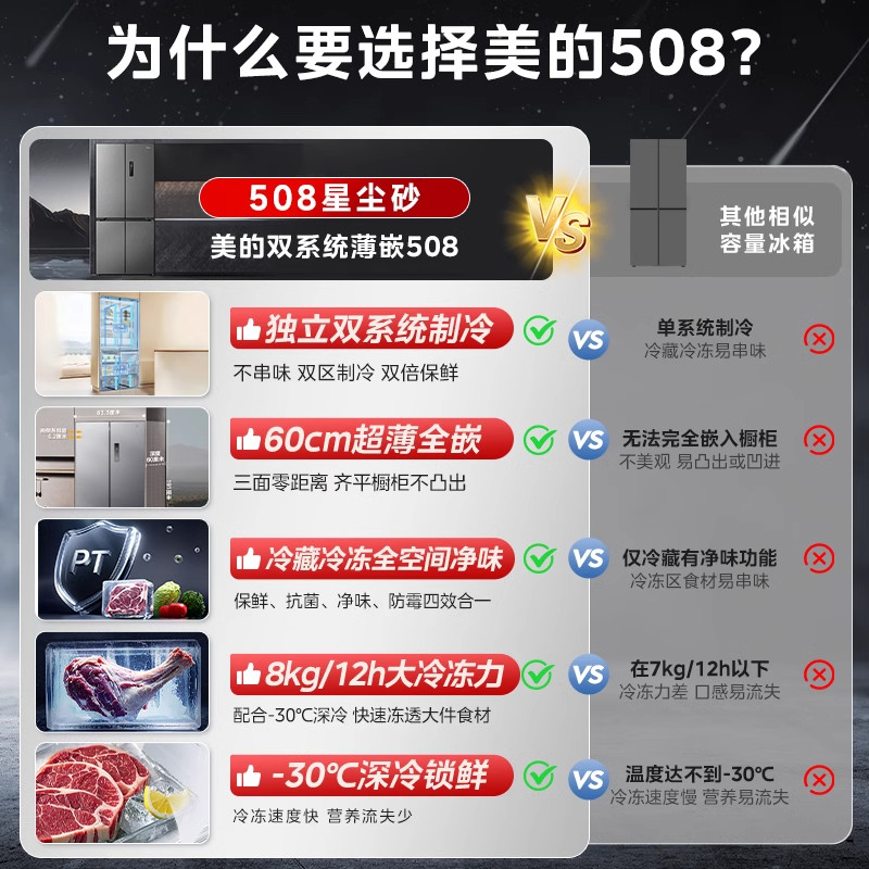 【新品】美的508超薄零嵌入冰箱十字双开四门大容量家用风冷无霜