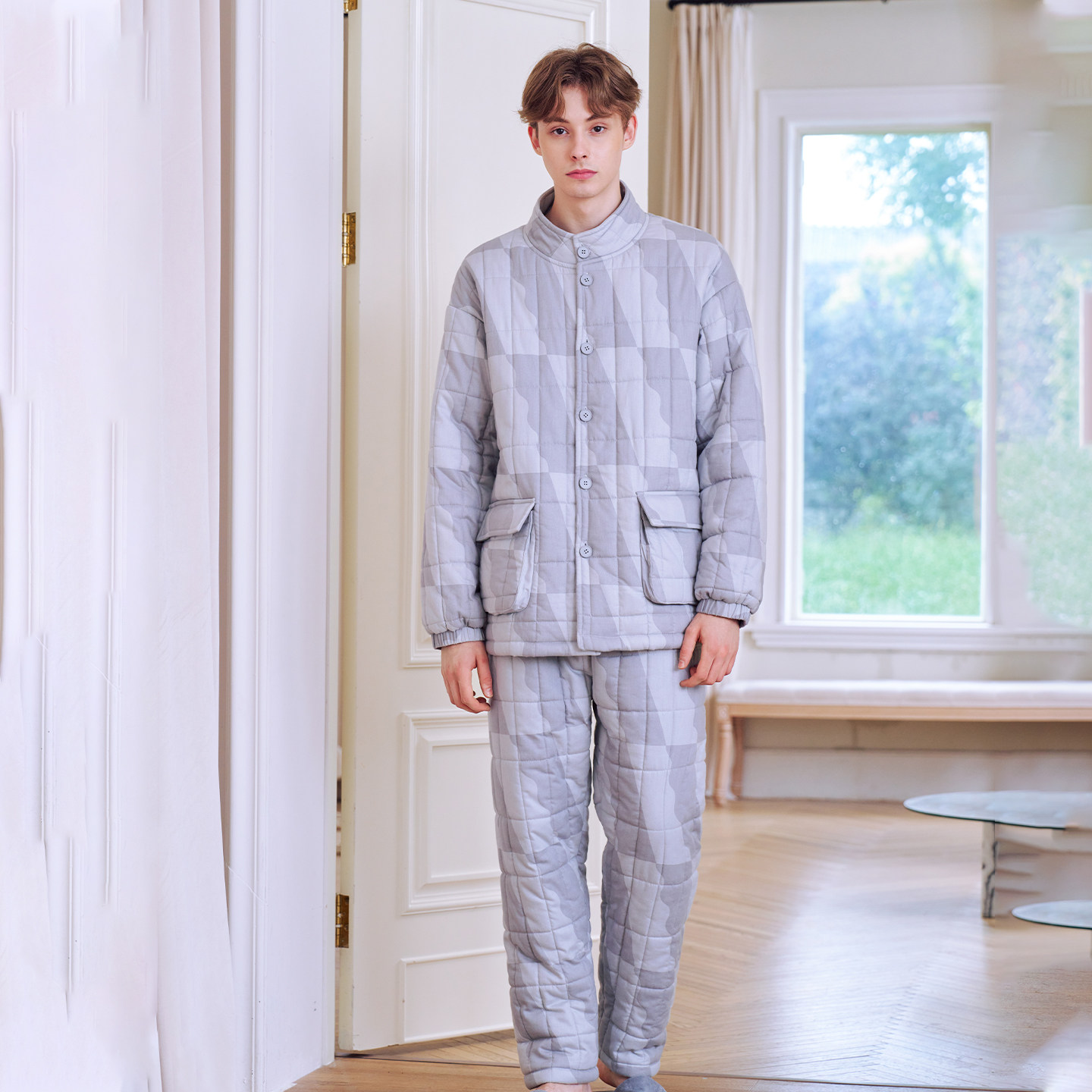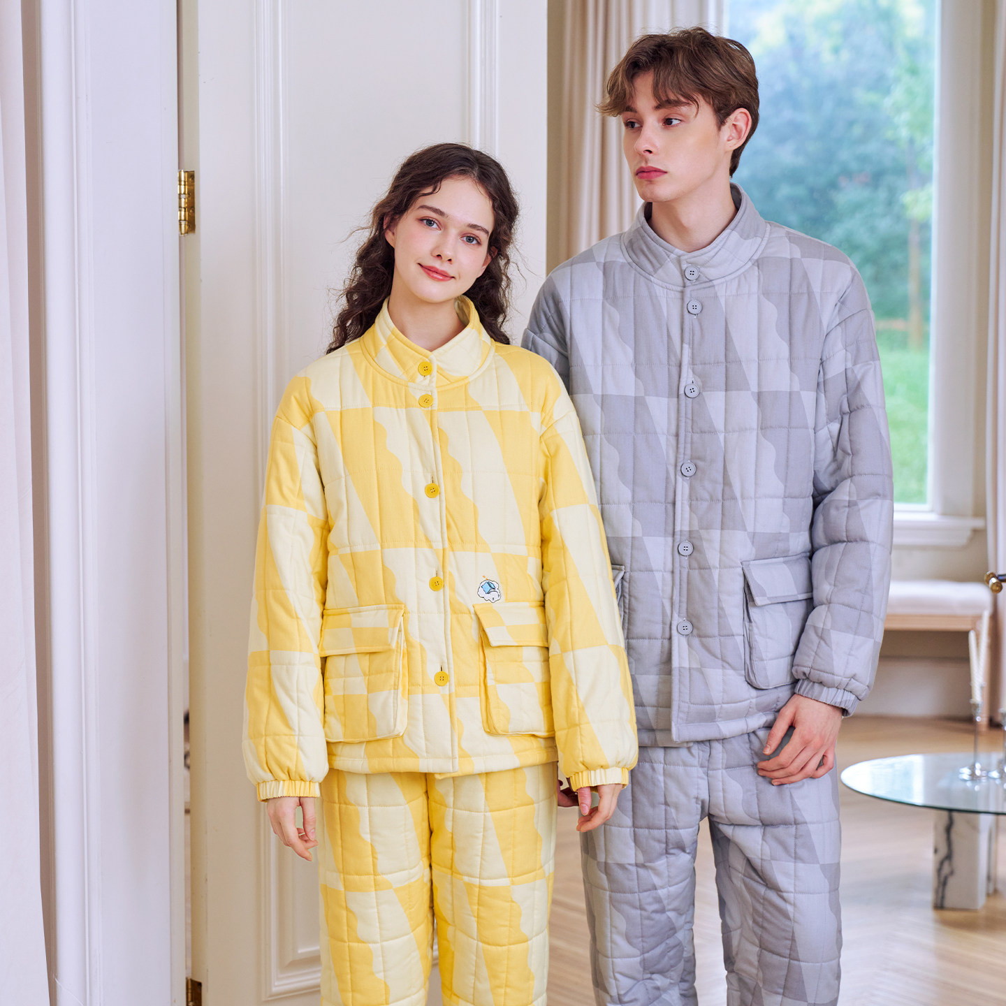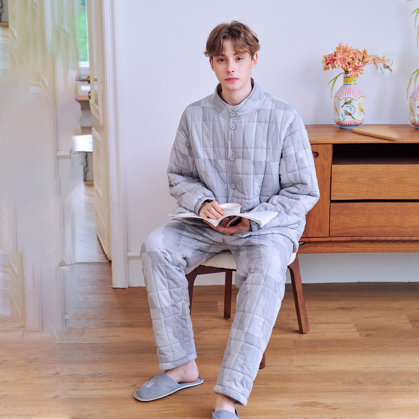 美标立领情侣三层加厚夹棉纯棉睡衣套装女男士全棉可外穿家居服冬