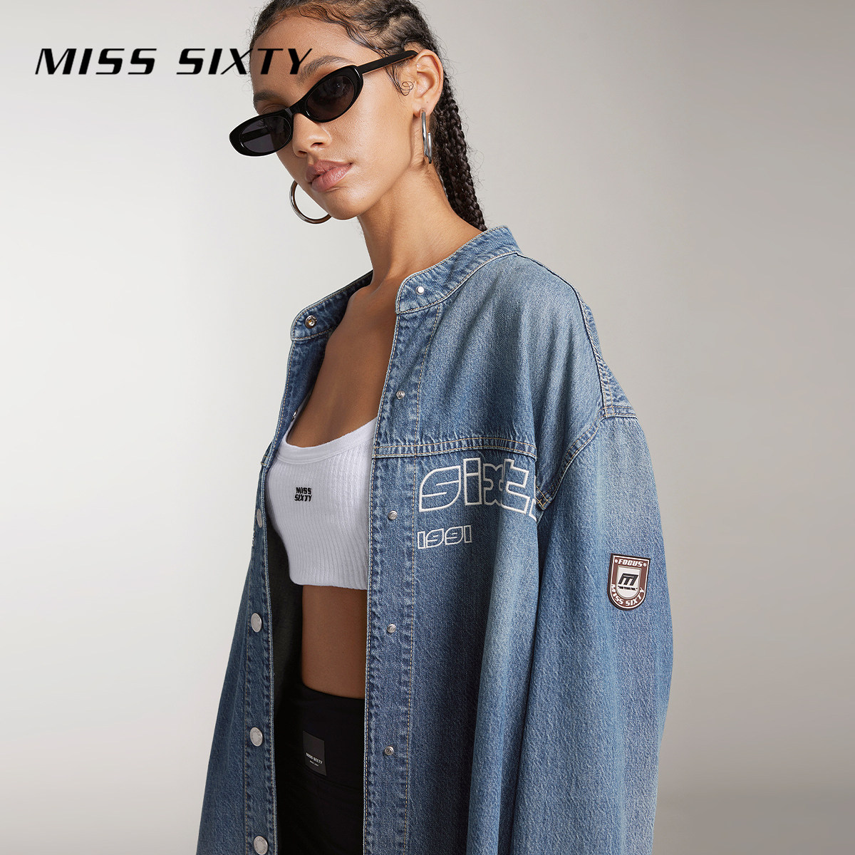 Miss Sixty牛仔衬衫复古显瘦百搭女长袖宽松中长款赛车风印花