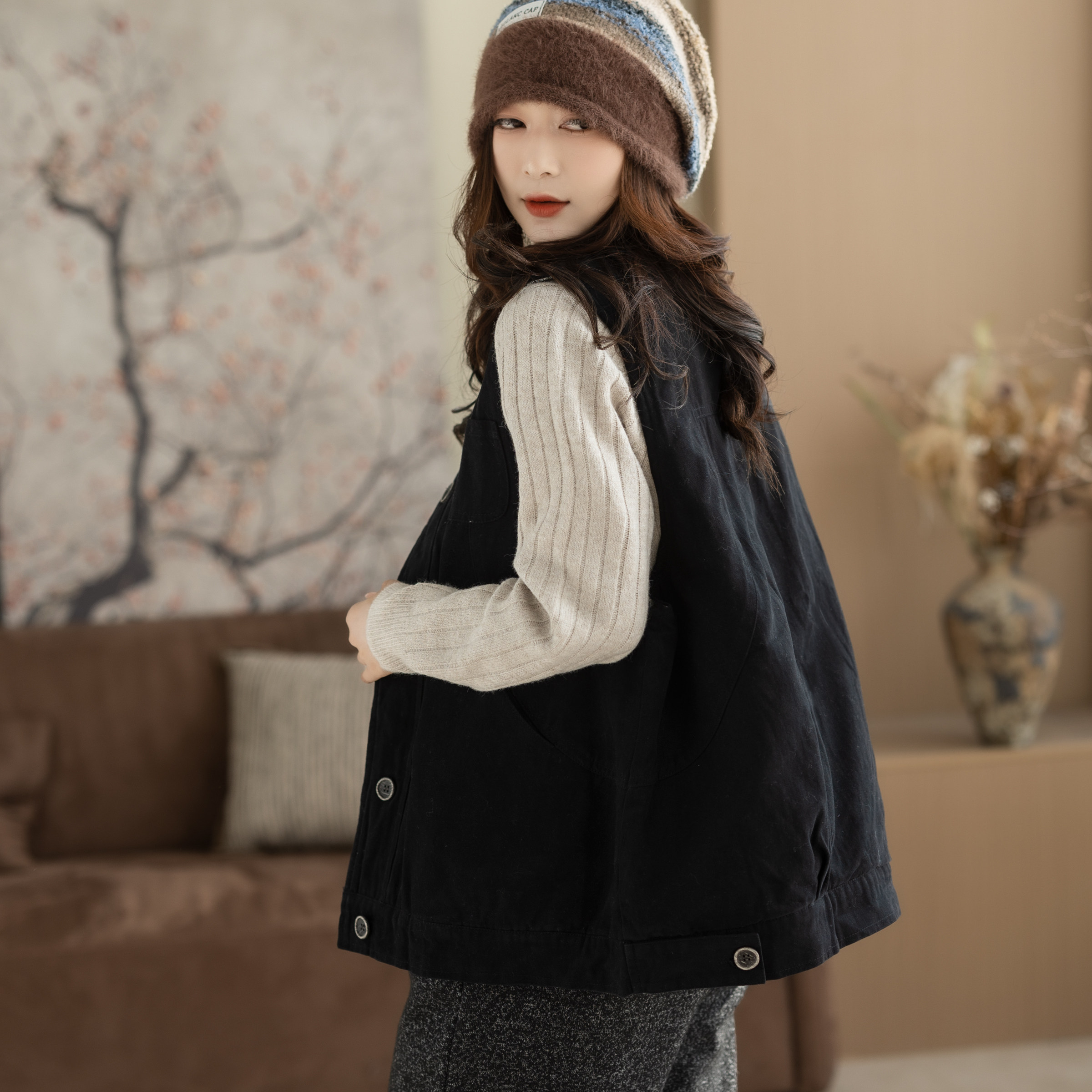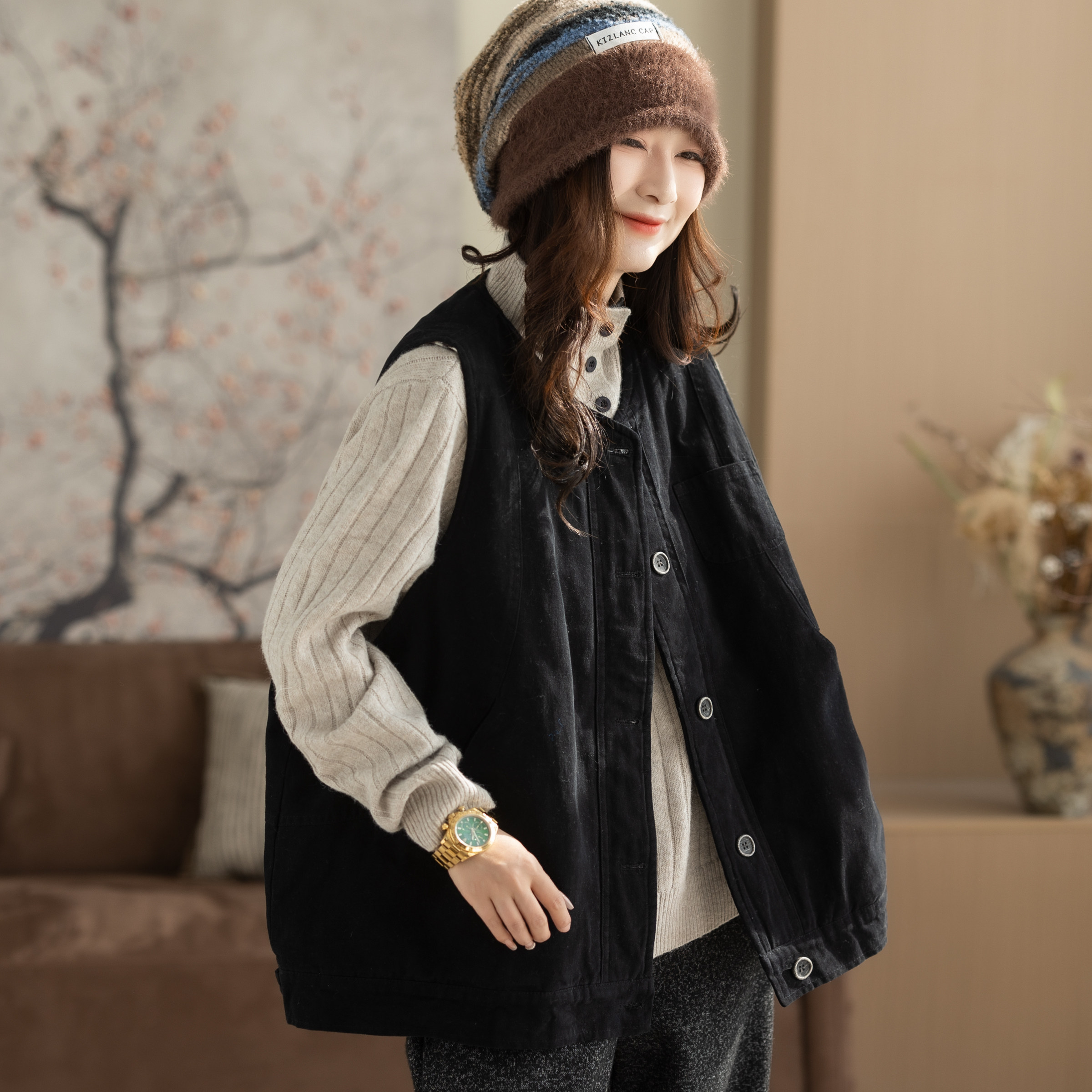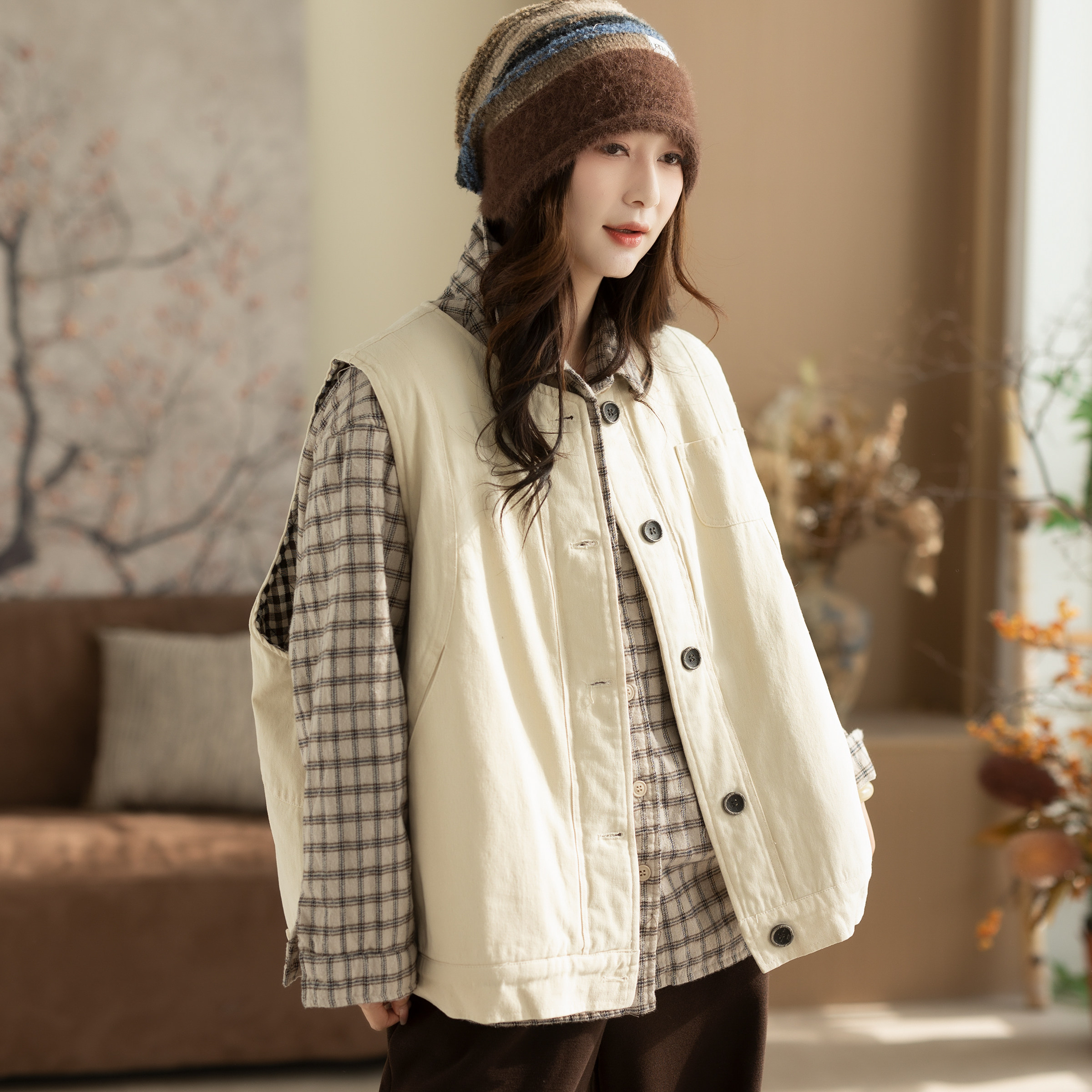 咖咪羽100%棉马甲女秋冬新款无袖坎肩女士流行复古纯色女装马夹