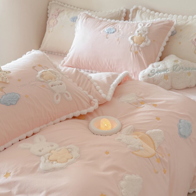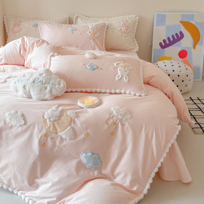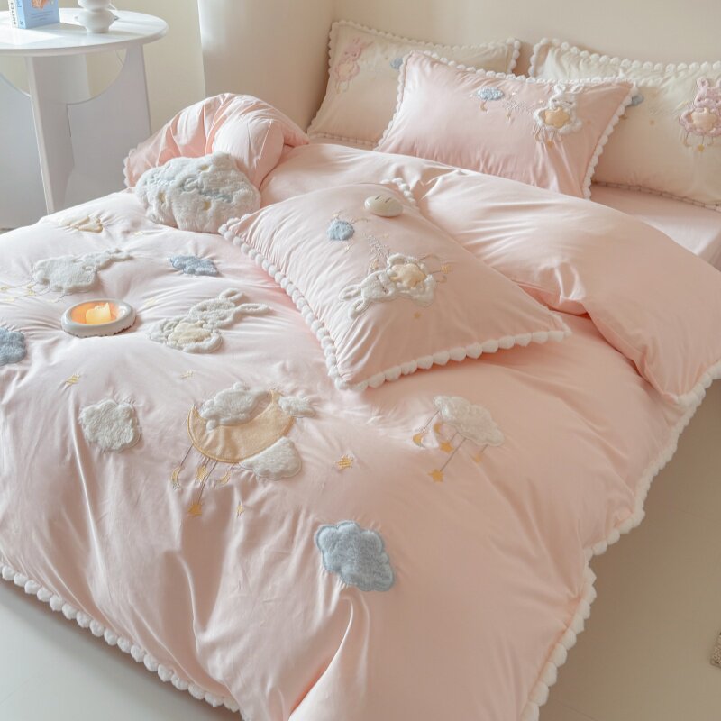 少女心云朵刺绣四件套全棉水洗棉卡通儿童公主风纯棉被套床上用品