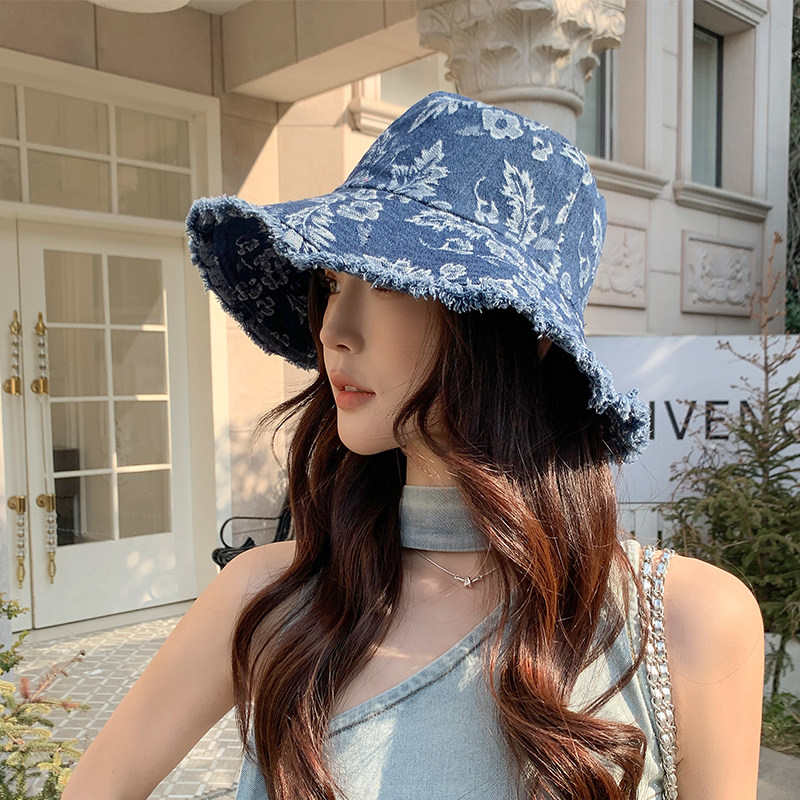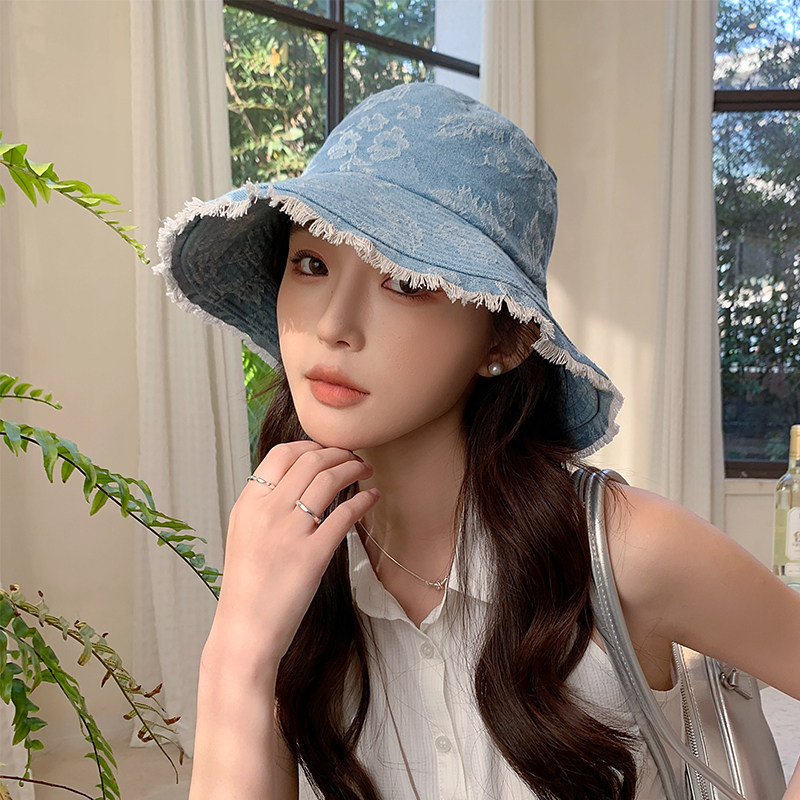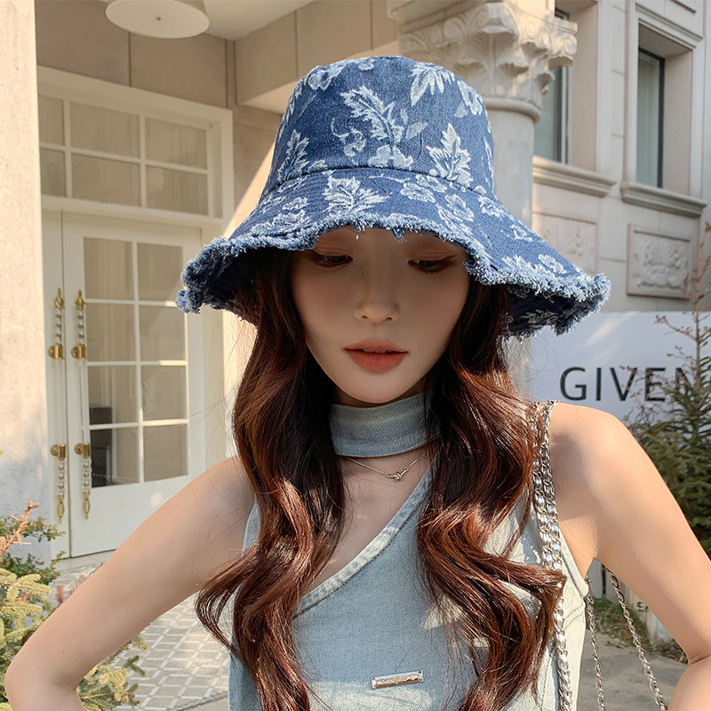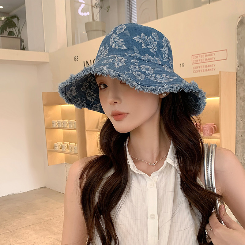 春秋季女时尚织花朵牛仔布渔夫帽水洗遮阳防晒旅游街头盆帽磨边
