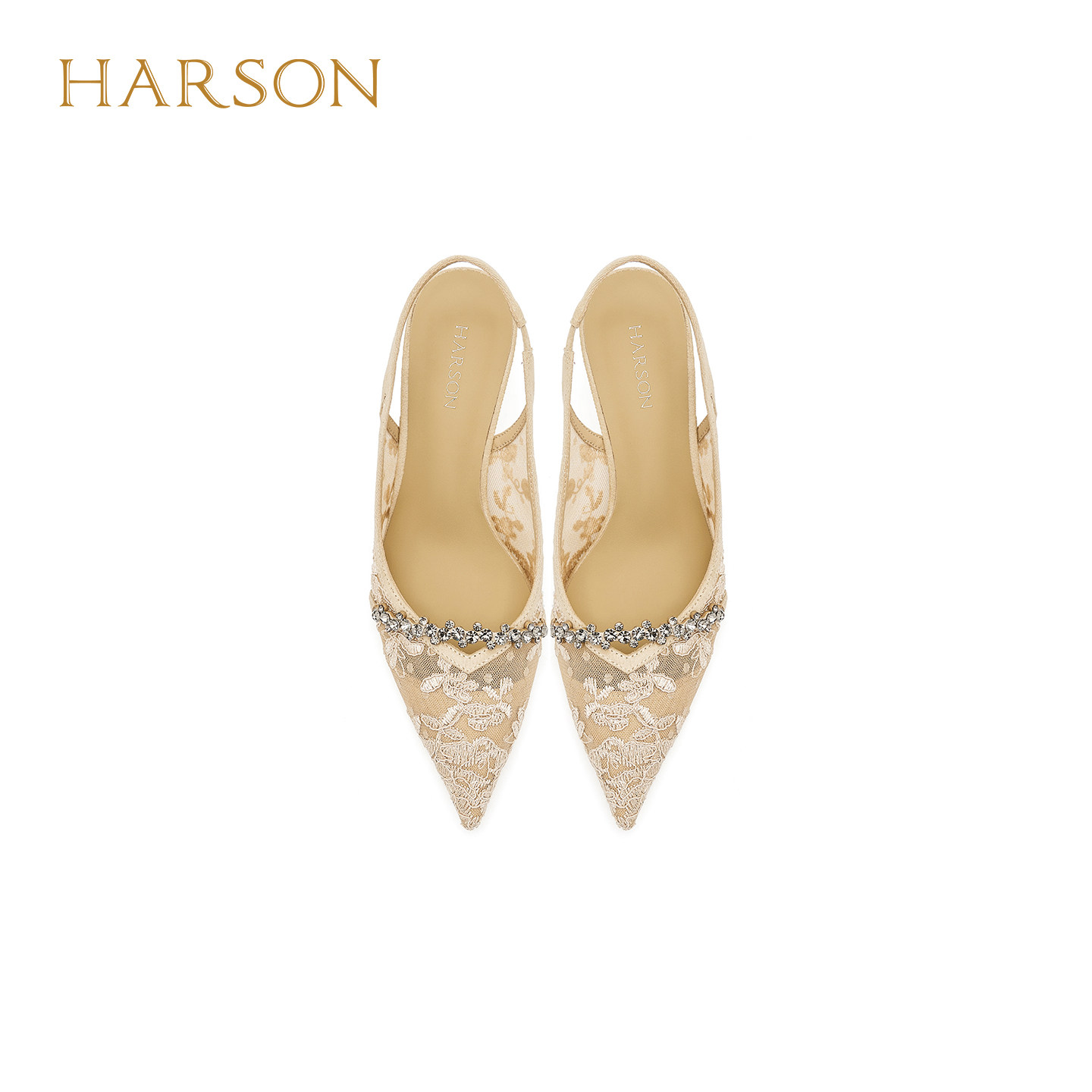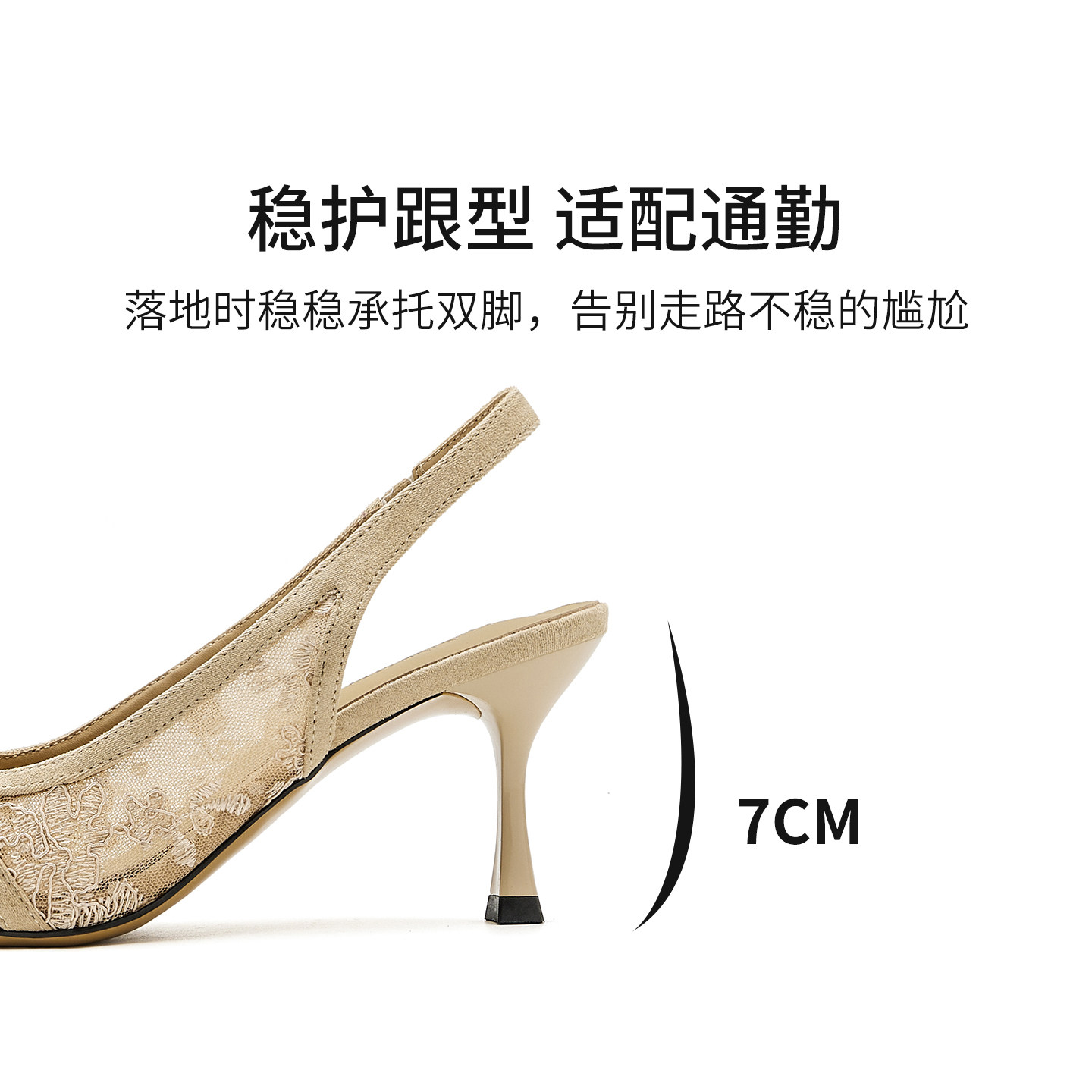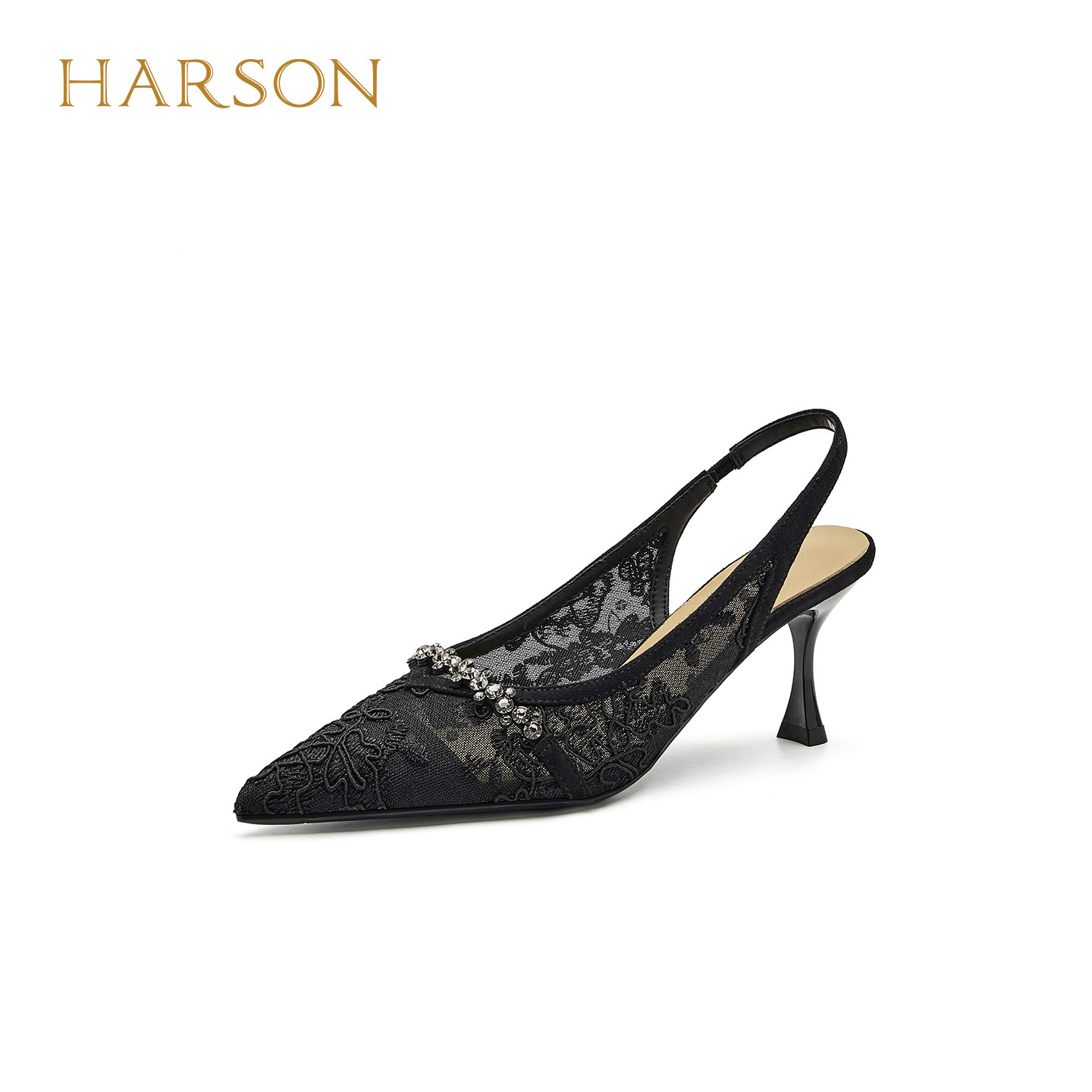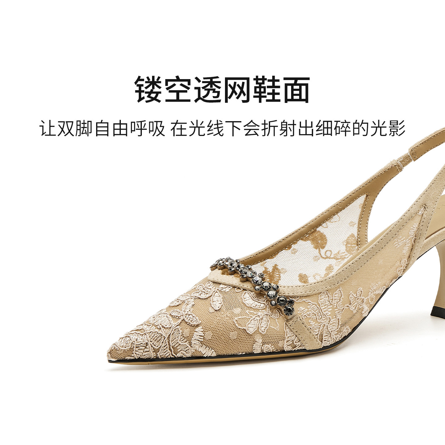哈森优雅风网纱尖头后空凉鞋女细跟水钻高跟鞋2026新款HWM260111